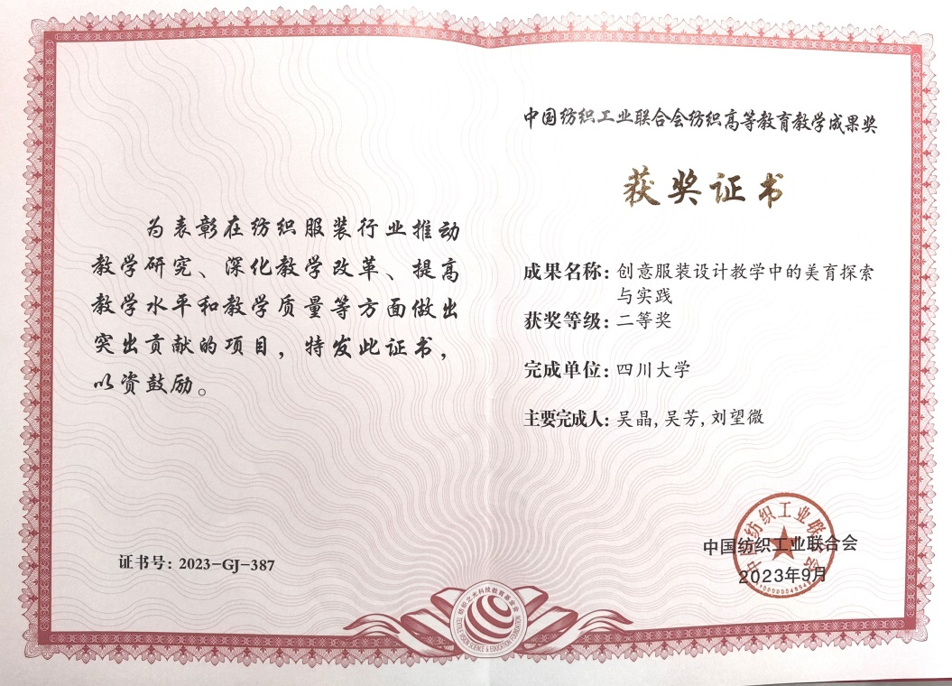 服装与服饰设计系时昱老师获“‘纺织之光’2023 年度教师奖”,蔡雨轩、李子安、彭红超、余金城、赵若绵五位同学获“‘纺织之光’2023 年度学生奖”,吴晶、吴芳、刘望微老师的教学成果“创意服装设计教学中的美育探索与实践”获“教育教学成果二等奖”。
