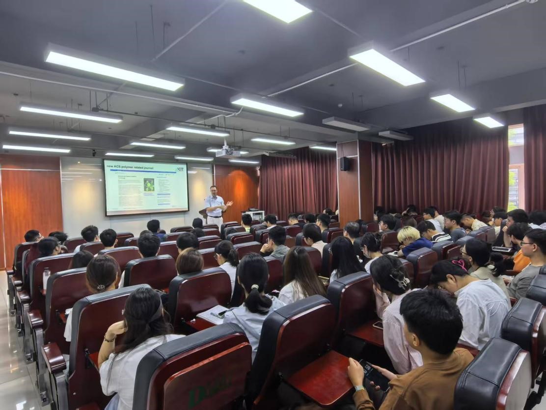 荣幸邀请到德国卡尔斯鲁厄理工学院(Karlsruhe Institute of Technology, KIT)的Patrick Théato教授,在皮革楼215报告厅作了题为《后聚合修饰技术(PPM)在功能聚合物纤维设计中的应用与展望》的学术报告。本次报告由尚娇娇老师主持,吸引了150余名师生积极参与。