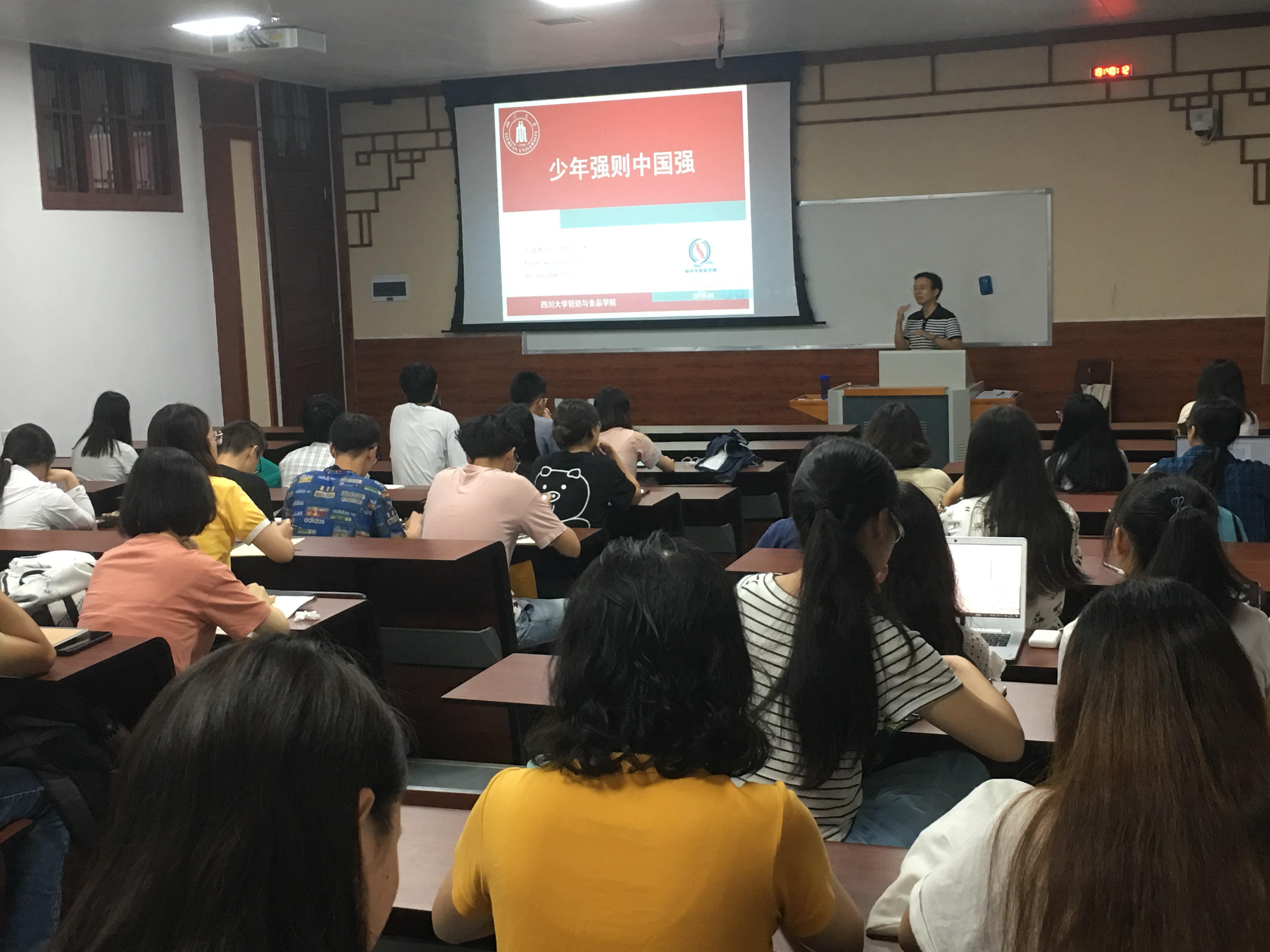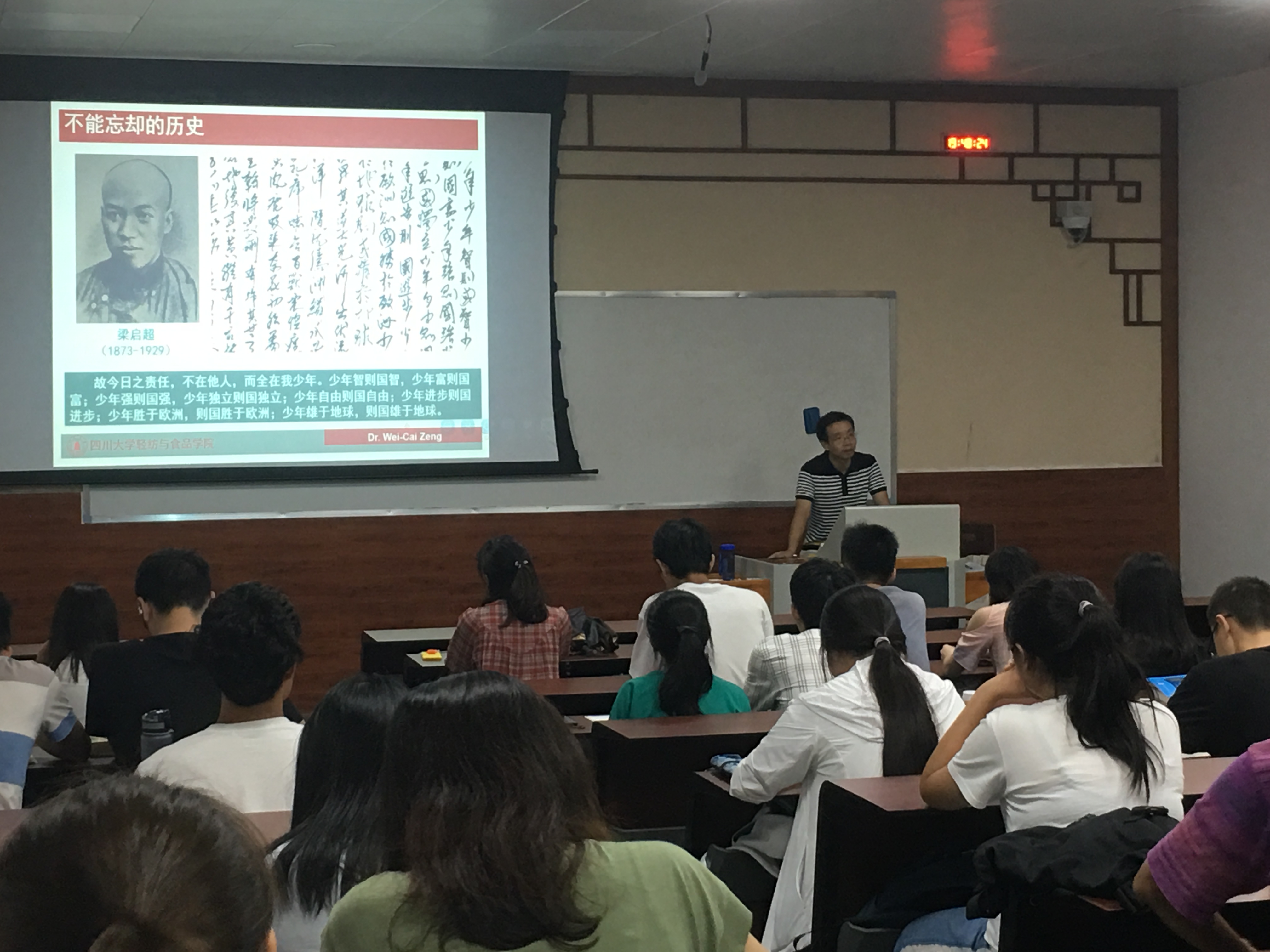 在第一次授课中,主讲教师曾维才副教授以“少年强则中国强”为主题,为同学们带来了一场生动的中国食品文化演进历史的爱国主义教育篇章。在授课过程中,曾维才副教授以中国近现代史发展为主线,以不能忘却的历史,晚清时期的鸦片战争为开端,引导学生发现、思考和认识“少年强则中国强”的深刻内涵。并以梁启超先生的《少年中国说》“故今日之责任,不在他人,而全在我少年。少年智则国智,少年富则国富,少年强则国强,少年独立则国独立,少年自由则国自由,少年进步则国进步,少年胜于欧洲,则国胜于欧洲,少年雄于地球,则国雄于地球。”激发了学生的爱国热情。同时以历史上伟大的科学家到当代的科学家,如钱学森、邓稼先、陈景润、华罗庚、袁隆平、王选等当年的青年入手,介绍了曾经的翩翩少年用自己无悔的青春和勤劳的汗水,把自己的一切都献给了新中国,在极其艰苦的条件下创造出了无数个举世瞩目的世界第一。由此引发当今青年有何理由不努力的深深思考。