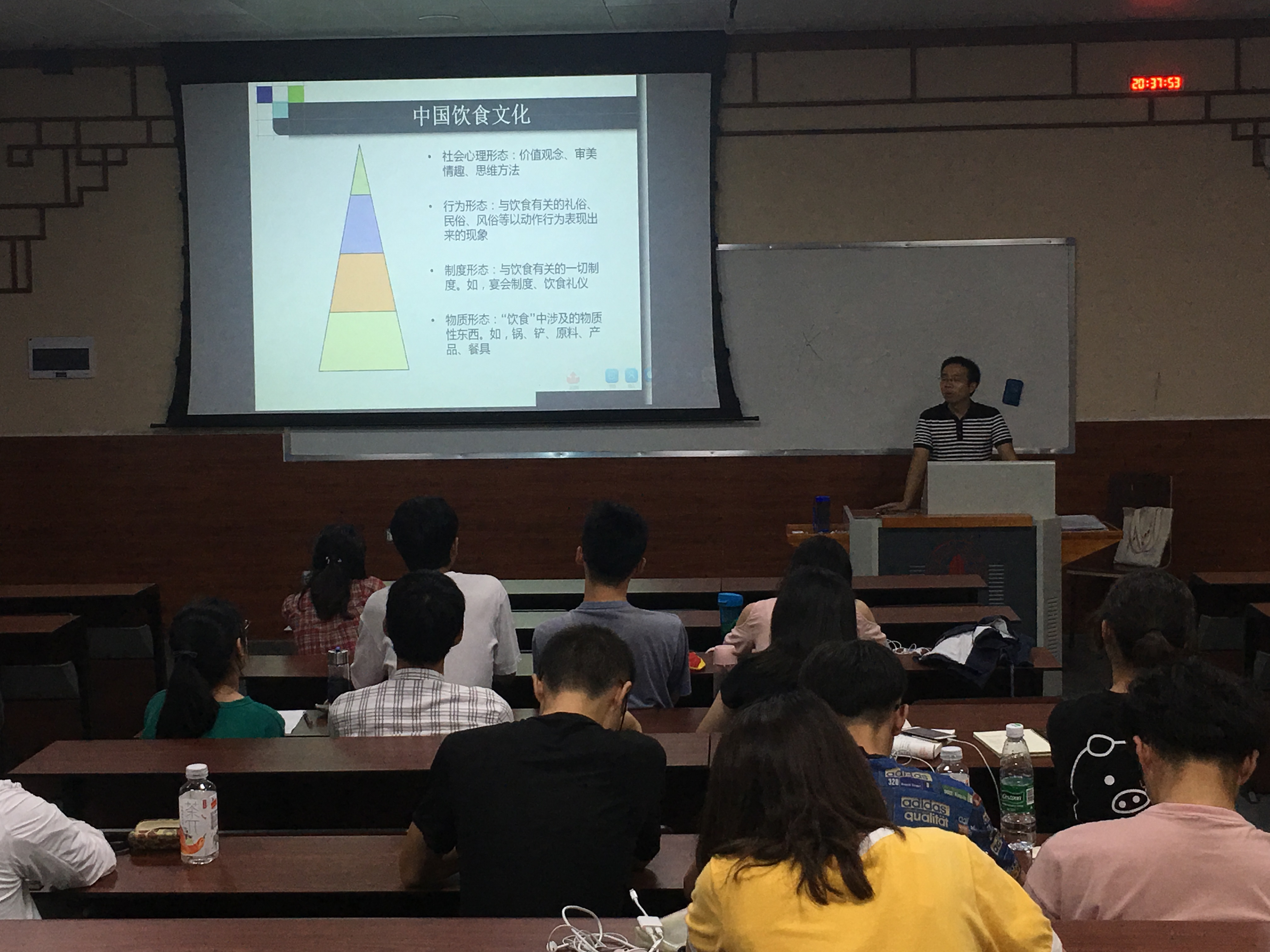 在中国饮食文化的讲解中,曾维才副教授从多角度剖析了饮食文化的内涵。从物质形态讲,饮食是涉及的物质性东西的总和;从制度形态讲,饮食是一切与饮食有关的所有制度的总和;从行为形态讲,饮食是一切有关的礼俗、民俗与风俗的总和;从社会心理心态讲,饮食是价值观念、审美情趣、思维方法的总和。因此,《中国食品文化与科学技术史》既是科学技术的发展史,更是通过饮食文化培养学生树立正确的人生观、世界观与价值观以及培养深厚的爱国主义情怀的重要阵地。本次丰富的课程思政内容引起了学生们的极大兴趣与爱国情怀,在同学们中收到了热烈的反响。