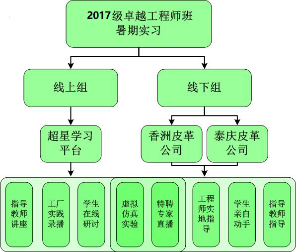 2020�7月,轻工科学与工程学院生物质与皮革工程系开启“线上线下混合实习”新模式,轻化工程专业负责人研判疫情风险区域等级、结合学生意愿及家长同意,在企业精诚合作下,克服重重困难完成�2017级卓越工程师�41名本科生的实习任务�