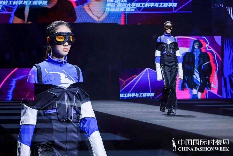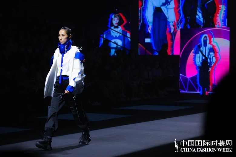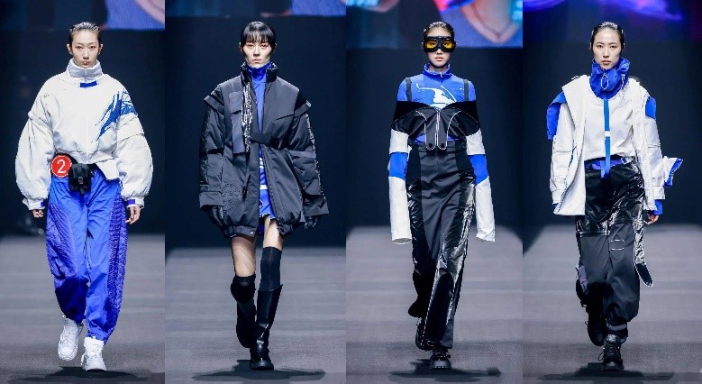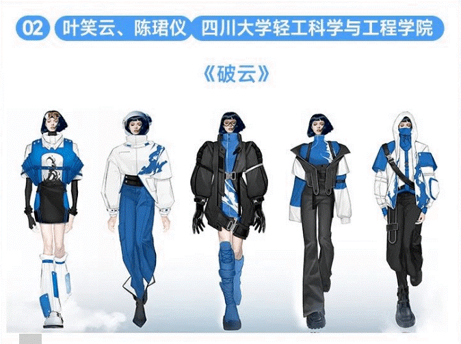 “须知少时凌云志,曾许人间第一流”,叶笑云、陈珺仪二人的作品灵感迸发于当代青年志冲云霄的雄心与勇气。整体设计以机能工装风为基调,以黑、白、蓝、灰为主色,将户外运动性与时尚潮流相结合。在服装结构和工艺细节上,同时加入了中国传统元素风格设计的航天图案,呼应主题。这种将传统设计与现代时尚融合碰撞的创新结合也得到了评委们的一致好评�
