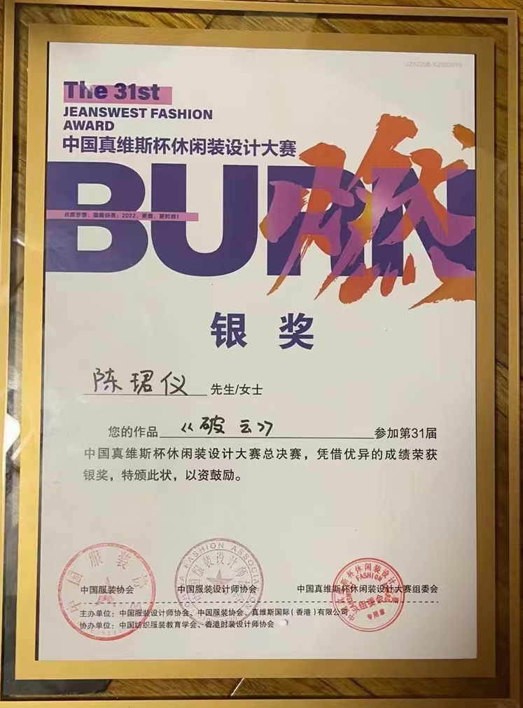 本届赛事以“燃”为主题,借“燃”之力,呼唤新时代服装人,用设计的力量点燃青春,奋斗青春,不负韶华。大赛由中国服装设计师协会、中国服装协会、真维斯国际(香港)有限公司联合主办,中国纺织服装教育学会、香港时装设计师协会和if时尚等多家单位共同协办。自启动以来,受到全国各地院校师生的关注,最终收到千余份投稿作品。历经效果图初评、现场答辩、总决赛动态展演等专业评审团多轮严格评分,叶笑云、陈珺仪二人作品最终喜获大赛银奖,创下我院学子历届参加该大赛成绩新高�