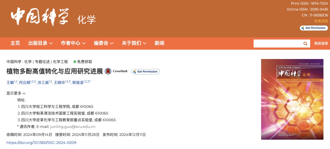郭俊凌教授在《中国科学:化学》发表了题为【植物多酚高值转化与跨领域应用研究进展】的专题论述。本专题论述简要地介绍了植物多酚高值转化研究的发展历程和最新进展,从而展望其作为大宗生物质资源在新兴领域的跨学科应用前景和发展思路。主要结合本课题组近年来相关研究工作,探讨了多酚生物质材料在吸附分离、药物递送和细胞治疗等交叉领域的应用。