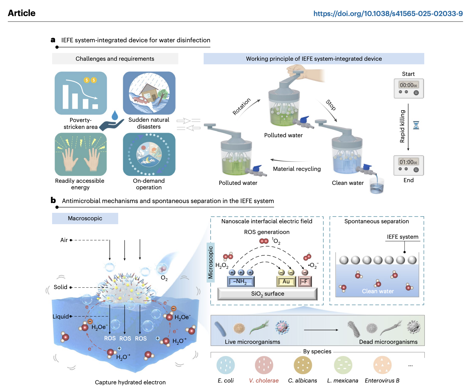 ),并将其转移至驻极体SiO2表面,使Au NPs带负电并与正电氨基形成稳定的局部纳米电场。另一方面,引入疏水性含氟基团(−F)形成SiO2@NFAu结构,显著提高界面负电荷密度,增强界面电场强度与反应活性。该IEFE策略实现了机械输入能量与界面反应的高效耦合,大幅提升了ROS的生成效率,使系统能够在仅1分钟内实现霍乱弧菌(Vibrio cholerae)6-log级(99.9999%)的快速灭活。值得一提的是,该系统不仅对细菌、真菌、病毒及寄生虫等多种病原体表现出优异的广谱杀灭性能,还可实现纳米颗粒自发分离、避免二次污染,展现出在资源受限地区及灾害应急净水场景中的巨大应用潜力(图1)。更重要的是,该研究提供了一种从界面电荷调控出发的催化剂设计范式,打开了摩擦发电与界面催化结合的新方向,为能量转化与环境净化领域的交叉研究奠定基础。