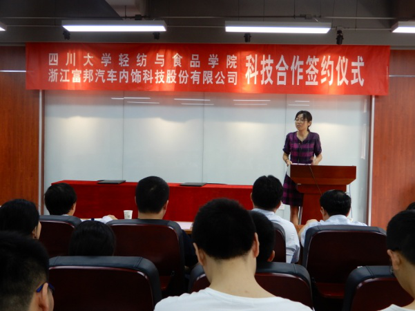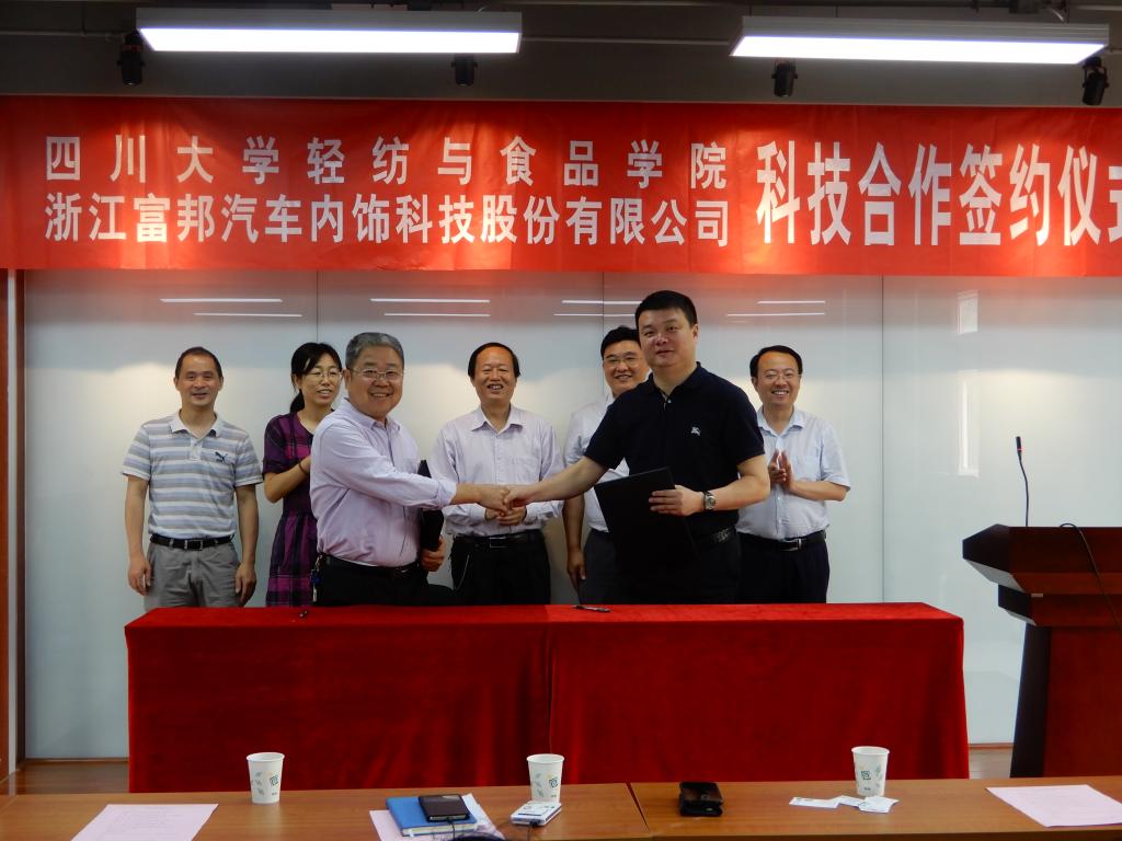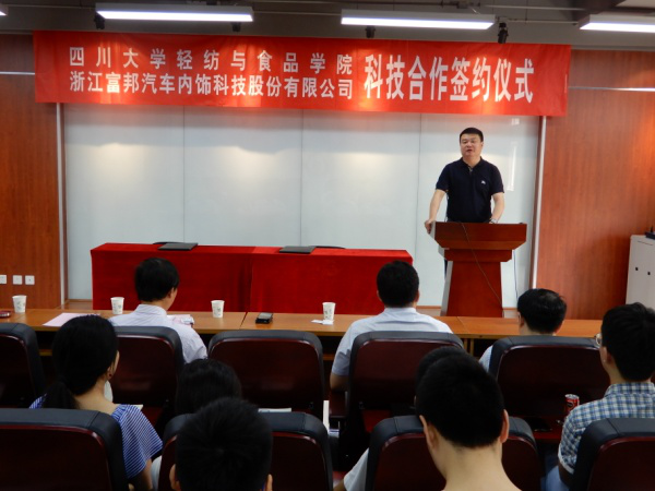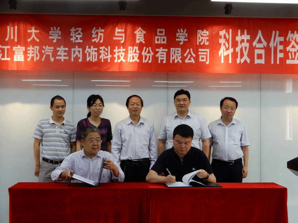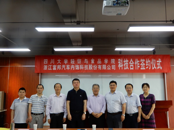 浙江富邦汽车内饰科技股份有限公司成立�2014�7月,是一家专业生产、销售汽车内饰皮革及内饰相关产品的企业,在皮革界享有盛誉。早在上世纪90年代初,原成都科技大学皮革工程系就与富邦集团(前身为海宁上林制革厂)建立了密切的联系,长期保持着广泛的交流与合作。在新形势下,为了进一步加快企业发展,实施科技兴企战略,不断提高企业的综合素质和整体经济实力,富邦公司决定与四川大学开展“高端功能性汽车内饰材料国际化产学研协同创新平台建设”工作。我们相信,通过本次合作,将充分整合四川大学的智力资源和富邦集团的硬件资源,开展平台建设、技术合作、新产品开发、骨干培训、实习就业等全方位合作,助力院系双一流建设,促进企业的跨越式发展,实现共赢多赢,开启校企合作的新篇章�