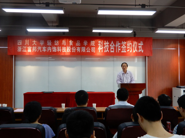 2018�5�18日上�10:30,四川大学与浙江富邦汽车内饰科技股份有限公司科技合作签字仪式在皮革楼报告厅隆重举行。四川大学轻纺与食品学院党委刘晓虎书记、轻纺与食品学院院长何有节教授、浙江富邦汽车内饰科技股份有限公司��董事�、四川大学科学技术研究院彭泽龙科长�四川大学生物质与皮革工程系主任林炜教授��党支部书记程海明教授、资�皮革专家但卫华教授、皮革系办公室邱华军主任和皮革工程教研室主任但年华副教授�出席了签约仪��