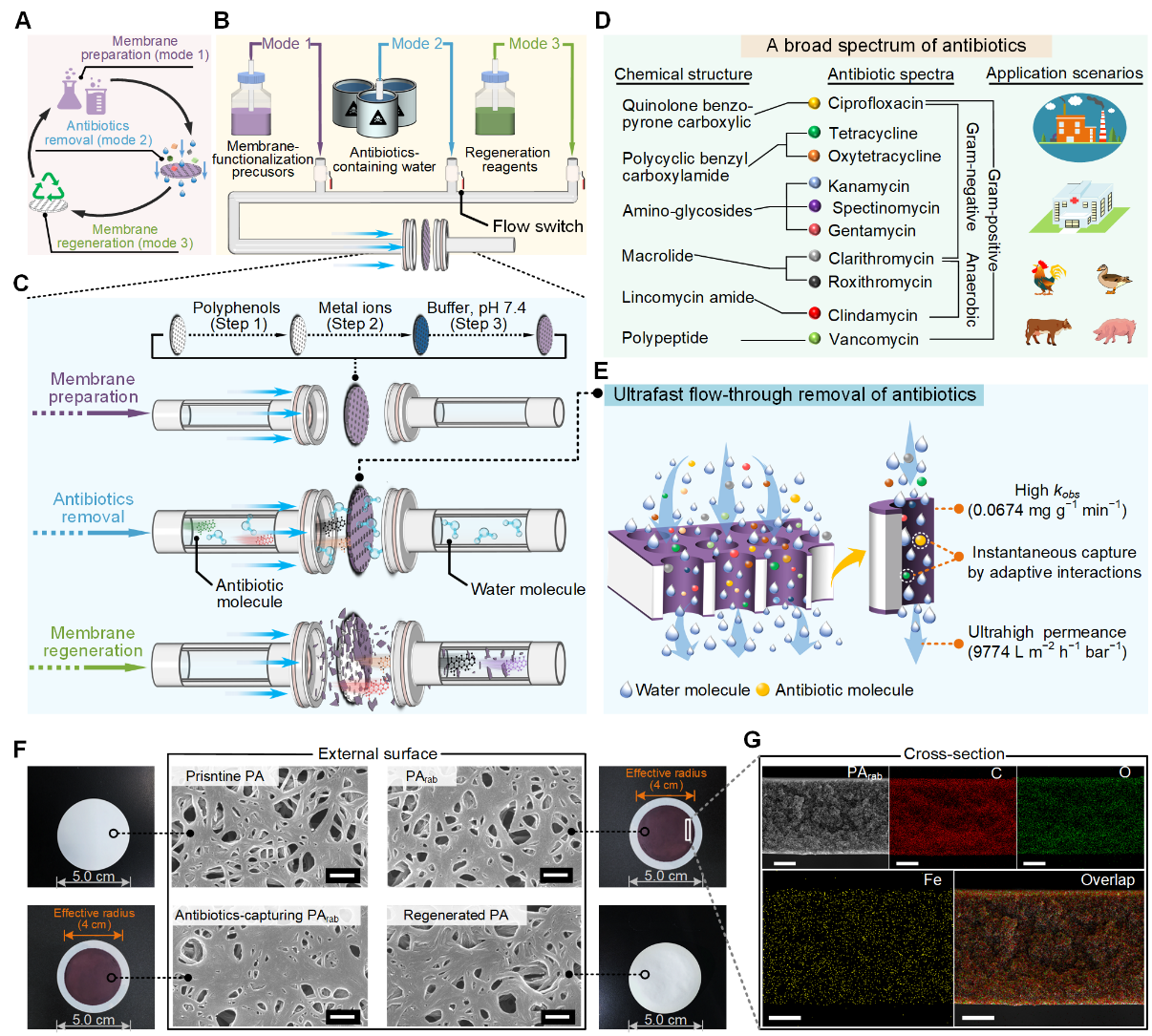 十大基础科学进展”。基于这样的前期的研究工作,在本研究中郭俊凌教授团队进一步开发了一种天然植物多酚功能化的可再生(regenerable)的微孔吸附(adsorption)膜(PArab)膜,并将其应用于水体抗生素的去除。该研究实现了微孔吸附膜的制备、抗生素去除及微孔吸附膜再循环使用的一体集成化,能够避免实际水处理中复杂的拆卸更换膜的过程,便于实际的应用。并且通过动态流动式制备工艺,实现了金属多酚超分子网络纳米涂层在聚酰胺(PA)膜微孔壁上的均匀分布。此外,由于该纳米涂层对抗生素的超高吸附速率及多重作用力吸附机理,实现了对抗生素的广谱性去除。该技术手段具有超高流速、高去除率、能耗低、价格低廉等优势。对未来水体污染物去除技术的开发提供了一个新的策略。
