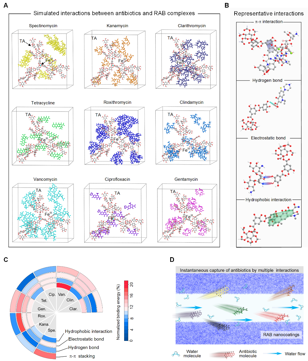 相比于活性炭,该PArab对环丙沙星的吸附速率有数量级的提升,实现了在超高水通量下,对抗生素分子的高效捕获。在超高水通量下(~8000‒10000 L m−2 h−1 bar−1),其对10种抗生素的去除率均达到90%以上。此外,研究发现,当抗生素溶液中含有较高的盐离子浓度以及变化溶液pH时,PArab仍然对抗生素具有较强的的吸附去除能力。为了进一步揭示PArab如何实现在超高水通量下对抗生素的高效去除,我们进行了石英晶体微天平吸附实验及分子模拟实验。石英晶体微天平吸附实验结果表明,金属-多酚超分子纳米涂层对10种抗生素均表现出明显的吸附能力。分子模拟实验表明,由于单宁酸特有的连苯三酚结构,金属-多酚超分子纳米簇对抗生素的吸附并不是基于某一单一的作用力,而是通过多重界面作用力相互协同的方式对抗生素分子进行捕获,这些作用力包括静电作用力、氢键、疏水键及π-π共轭作用力(图2)。以上结果为PArab实现对10种不同化学结构抗生素的捕获以及超高吸附速率提供了理论支持。