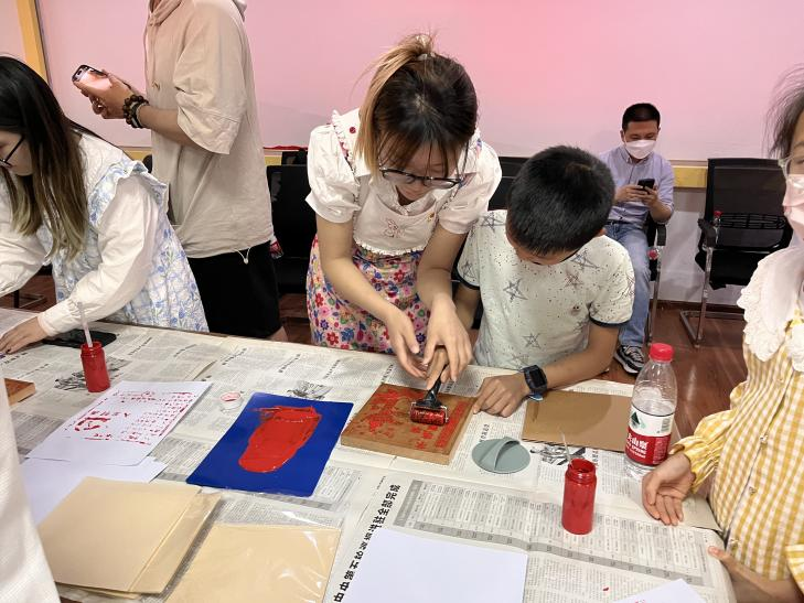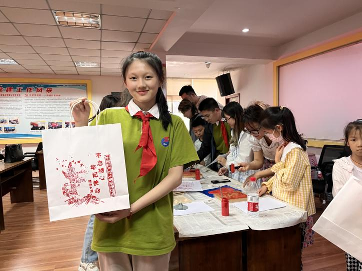 第三部分是由纺织服装研究生第二党支部的学生党员同志带领社区党员和中小学生体验非遗传统雕版印刷技艺。利用含有入党宣誓词、中国梦等党建元素的雕版,学习传统拓印技术,亲手拓印入党誓词,借助非遗技艺向党深情表白。雕版印刷是我国复制文献的传统技艺之一,支部宣传委员范雅新同志向大家介绍并演示了雕版印刷的步骤—上墨、放纸、刷印,即先在雕版上均匀涂上红色墨汁,再覆盖上一层纸,用工具有顺序地按压均匀,取拓纸,晾干……一幅鲜红的拓印画就完成了。大家认真地体验雕版印画工艺的每一个流程,并在纸袋子上动手印制了党建特色图案。这是一次传统文化与红色文化的碰撞交融,既推动了非遗文化的传承,又激活了红色文化新活力,弘扬了中国红色文化,传播正能量。