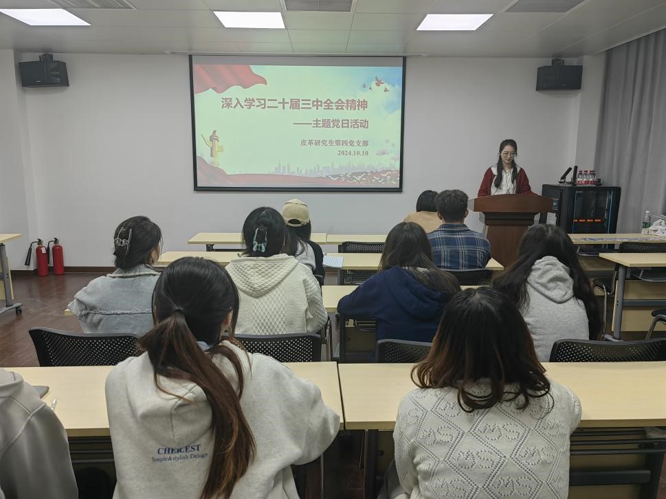 皮革研究生第四党支部于2024年10月11日16:00在皮革楼205教室开展“深入学习二十届三中全会精神”主题党日活动。本次活动由宣传委员孟慧涓同志主持。