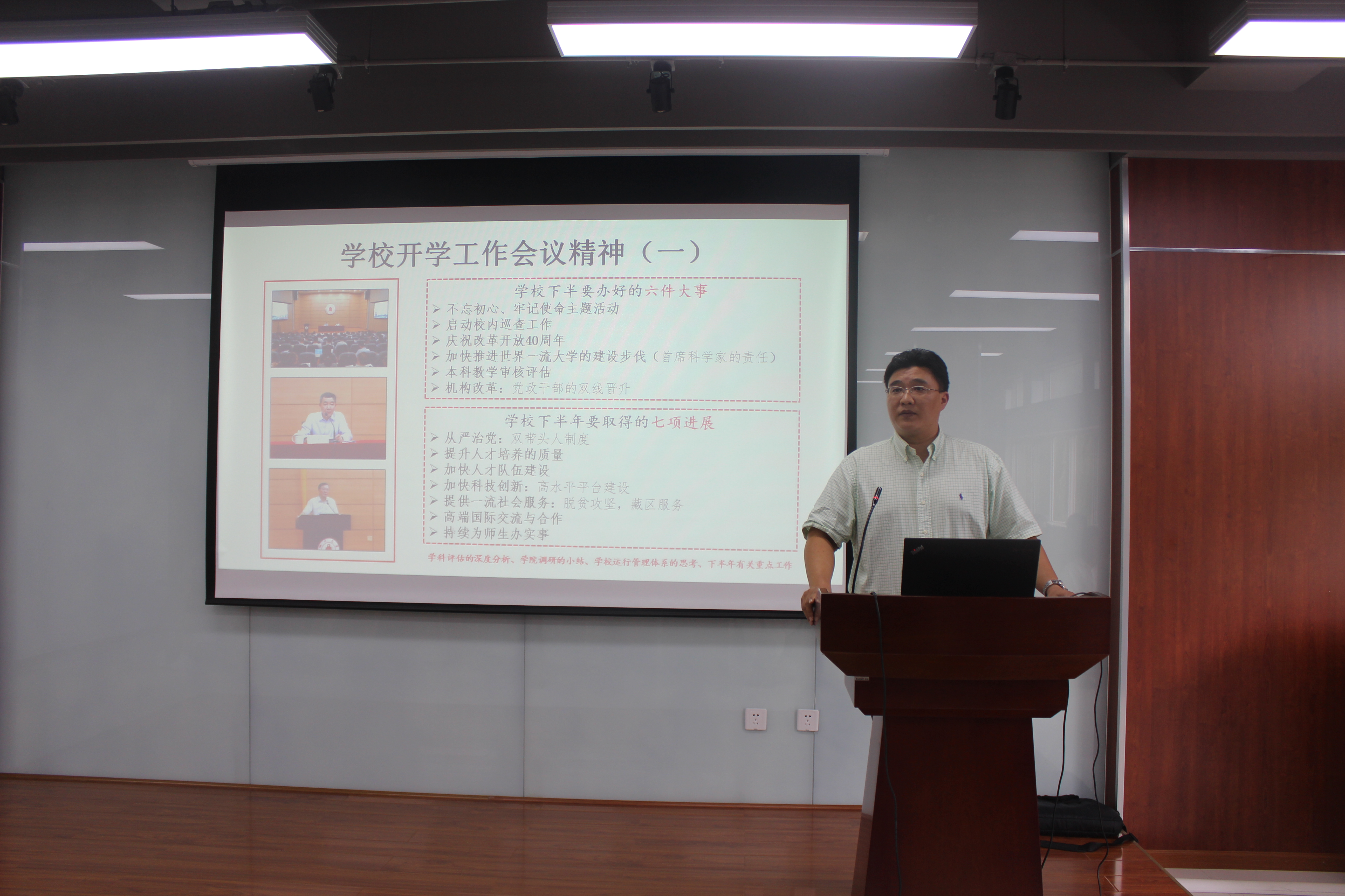 刘书记首先向全院教师传达了学校新学期工作会议的精神。同时结合“党建与业务工作实现深度融合、有效推进目标管理制、核心工作板块呈现起色、局部工作形成引领”等四个可喜局面,对学院的前期工作进行了总结;并从“保生存、保效益、保稳定、保发展”等四个维度提出学院的未来发展战略。最后刘书记结合国家、学校的大政方针,就当前的形势发展做了分析,向全体教师提出了“要明确新时代人才培养的要求”、“要关注新时代科研成果认定、人才评价标准的发展方向”等具体要求。
