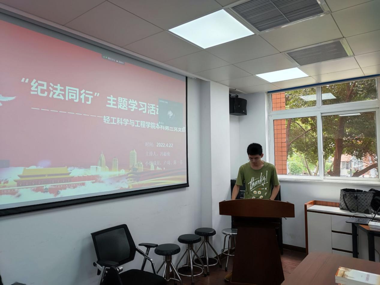 本科生第三党支部在纺工楼204会议室开展了 “纪法同行”主题党日学习活动。本次主题党日活动由本科第三党支部主题学习小组组织,冯毅俊同志主持。