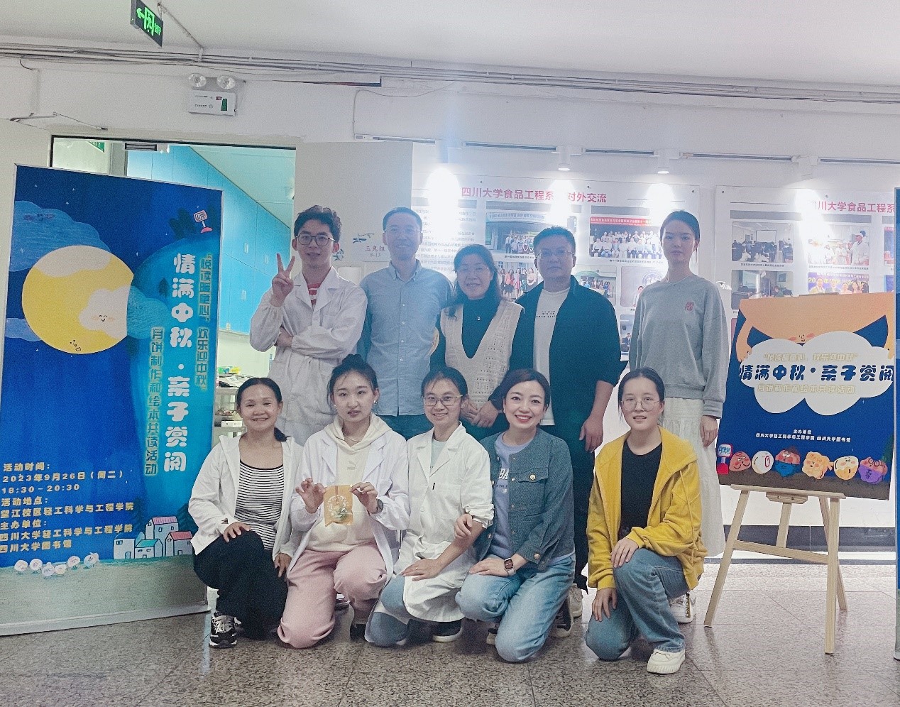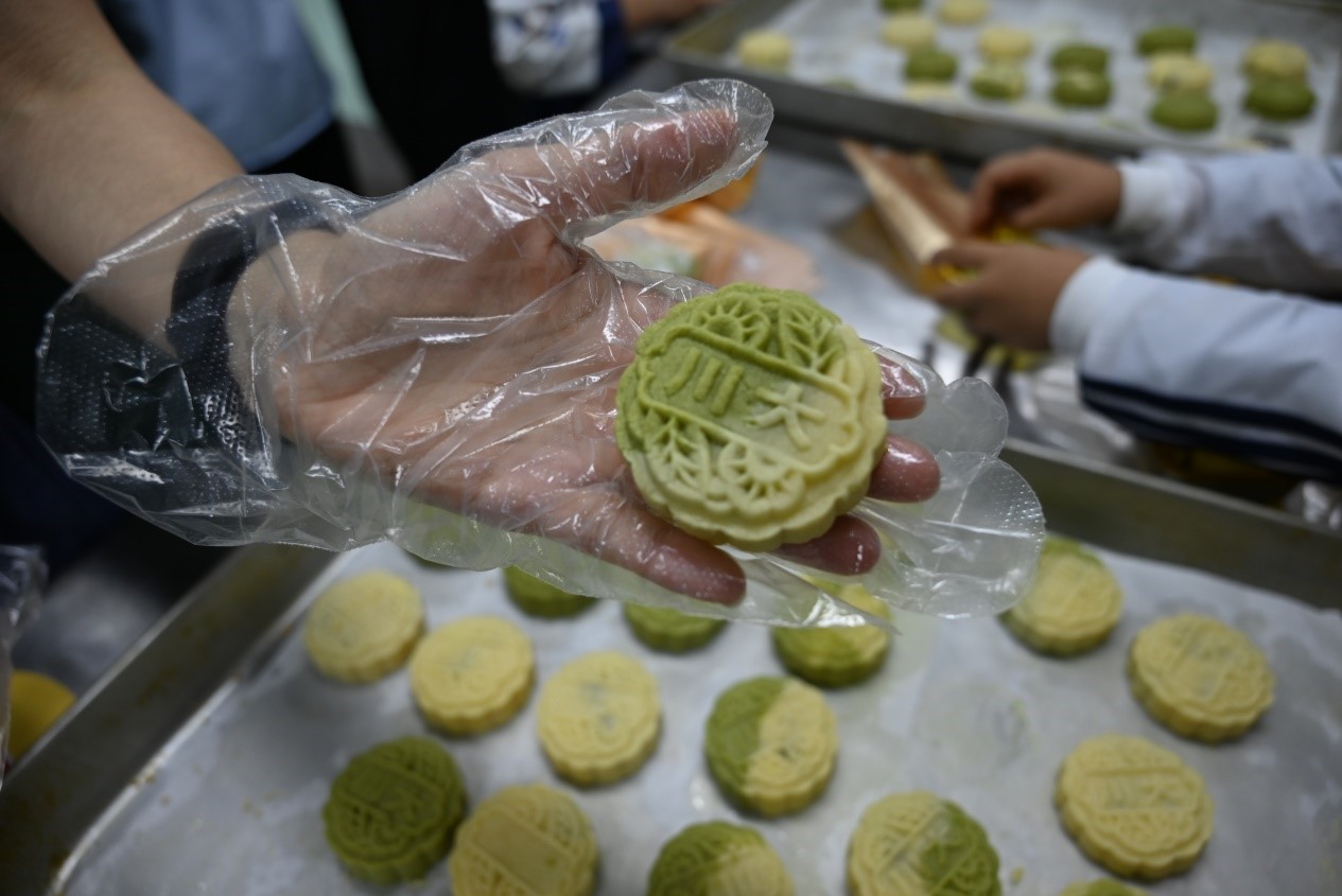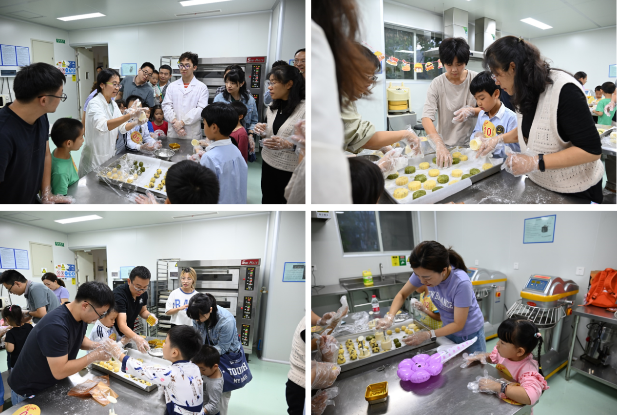 分工会副主席、食品科学与工程专业老师董怡副研究员和助教们分组教学,为大家讲解月饼制作方法和注意事项,随后教职工家庭自己制作月饼,揉皮、包馅、定型,一个个印有“川大”字样的定制月饼制作完成,大家相互展示、分享者自己的劳动成果,现场充满欢声笑语。