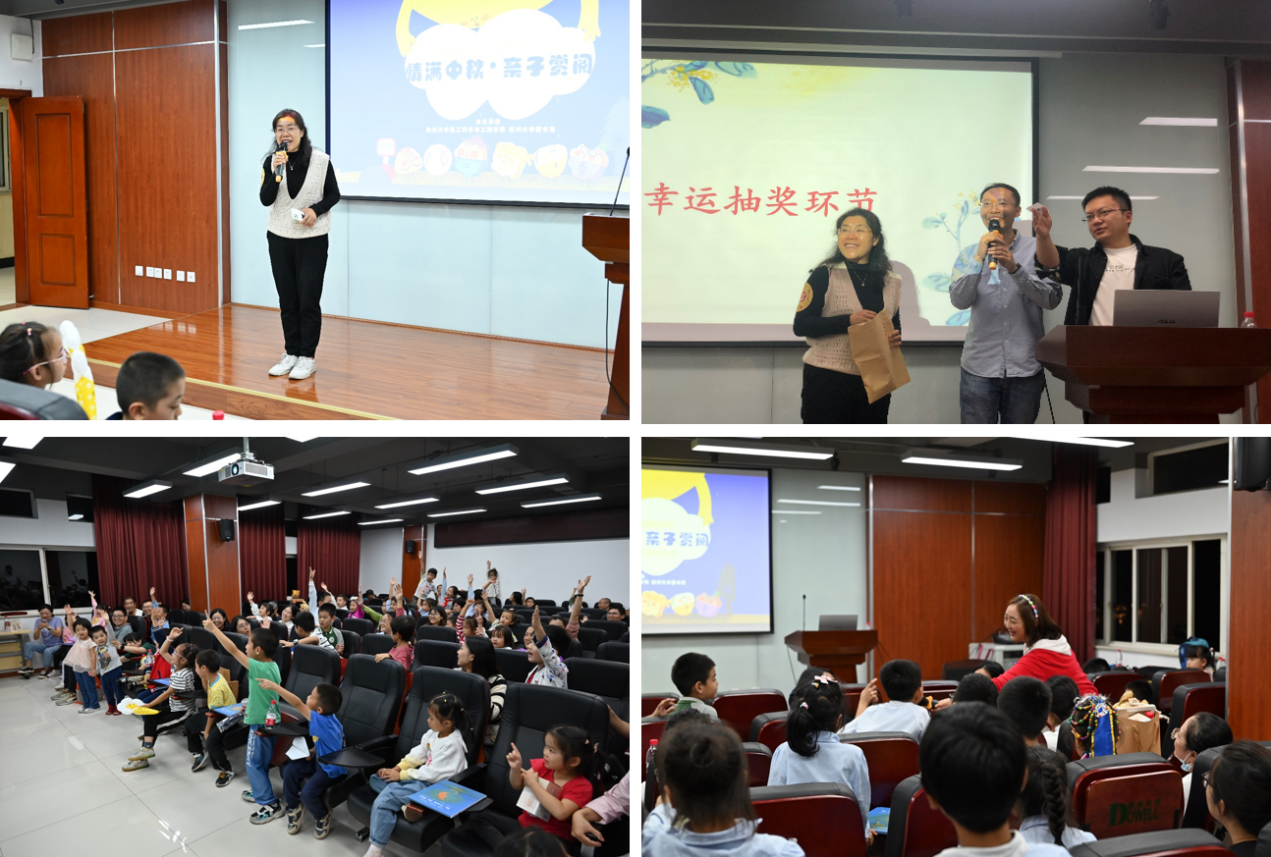 工会陈胜主席共同为小朋友抽取幸运奖。随后,图书馆樊伟老师主持诗词填空游戏,小朋友们积极抢答,并获得图书馆文创礼包。在热烈的活动气氛中,图书馆工会“书香川大?亲子悦读”活动负责人邹艳老师带领家庭共读绘本《从前有个月饼村》,小朋友们认真的聆听绘本故事并踊跃参与故事讨论,让孩子们真正享受阅读、爱上阅读,大家在快乐的氛围中感受到中国传统文化的魅力,寄托对花好月圆的美好期许。