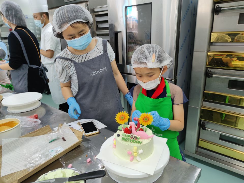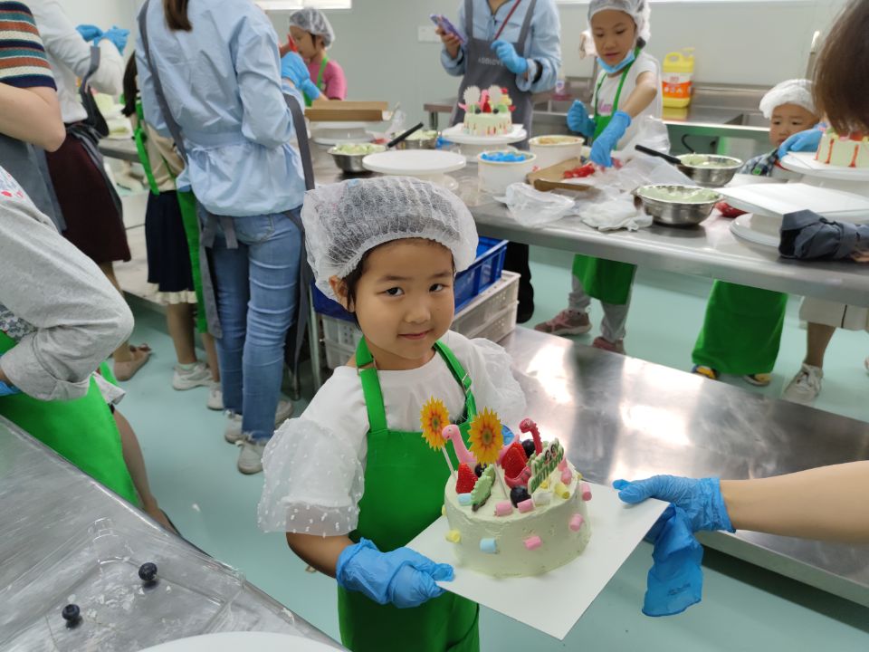 制作现场热闹非凡,弥漫着浓浓的甜蜜和快乐。在面点老师的指导和示范下,孩子们和家长一起大展身手,发挥想象在蛋糕胚上绘出美丽的奶油图案,用水果来点缀蛋糕出缤纷多彩的造型,享受节日温馨愉悦的亲子时光。