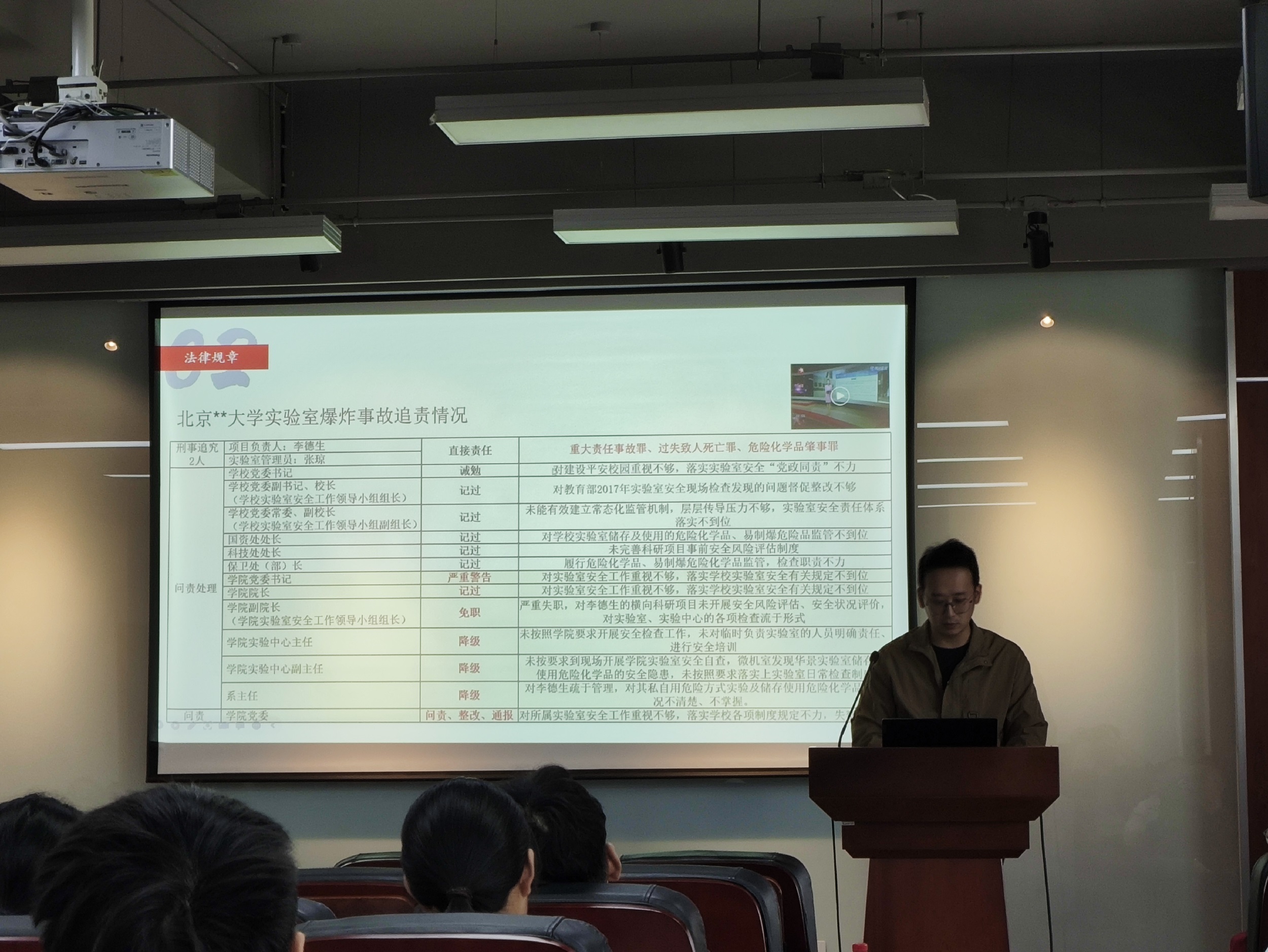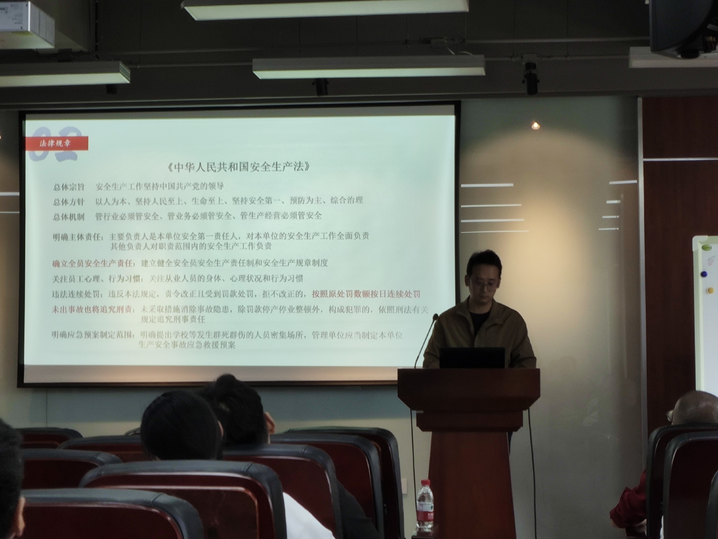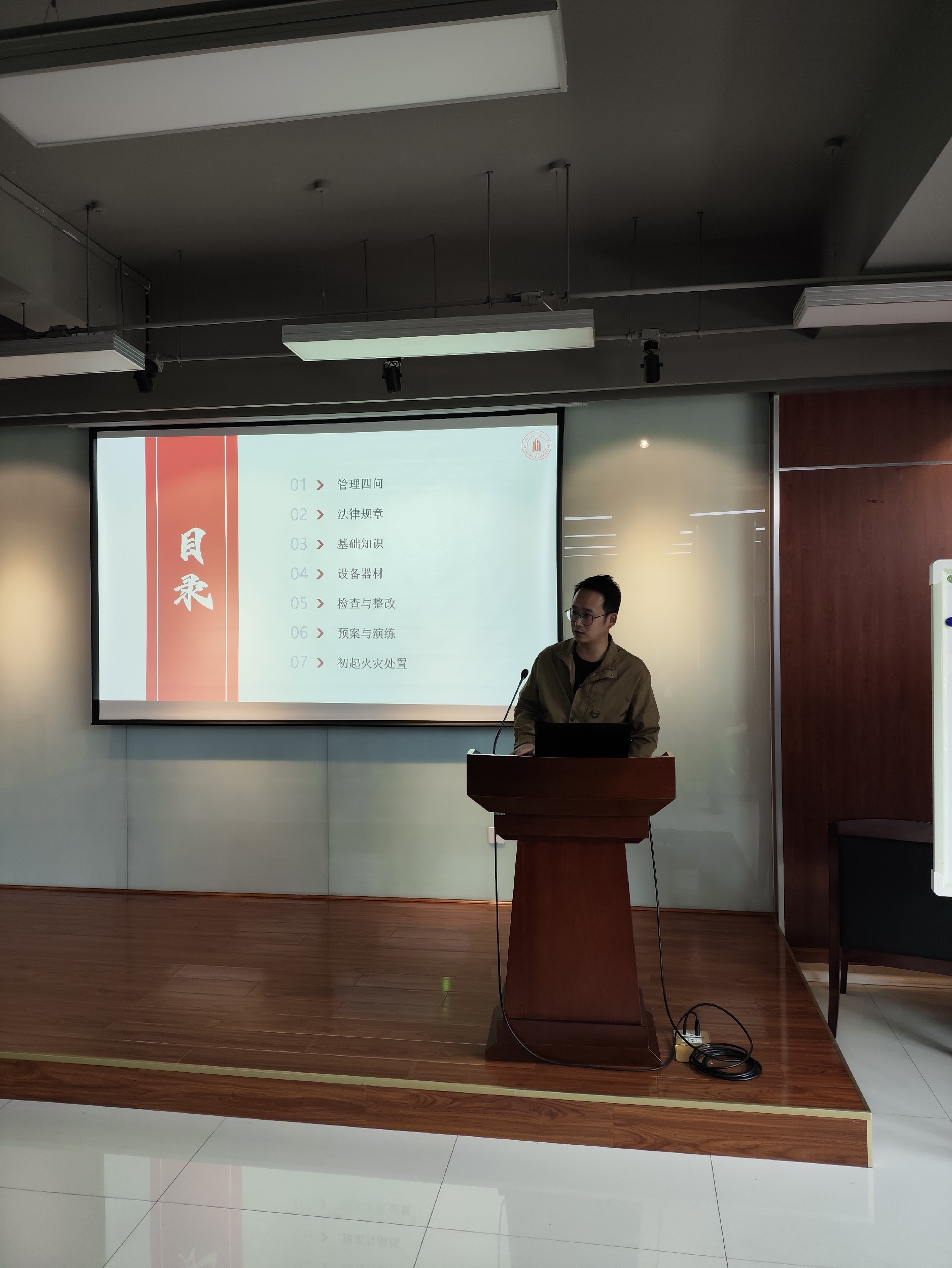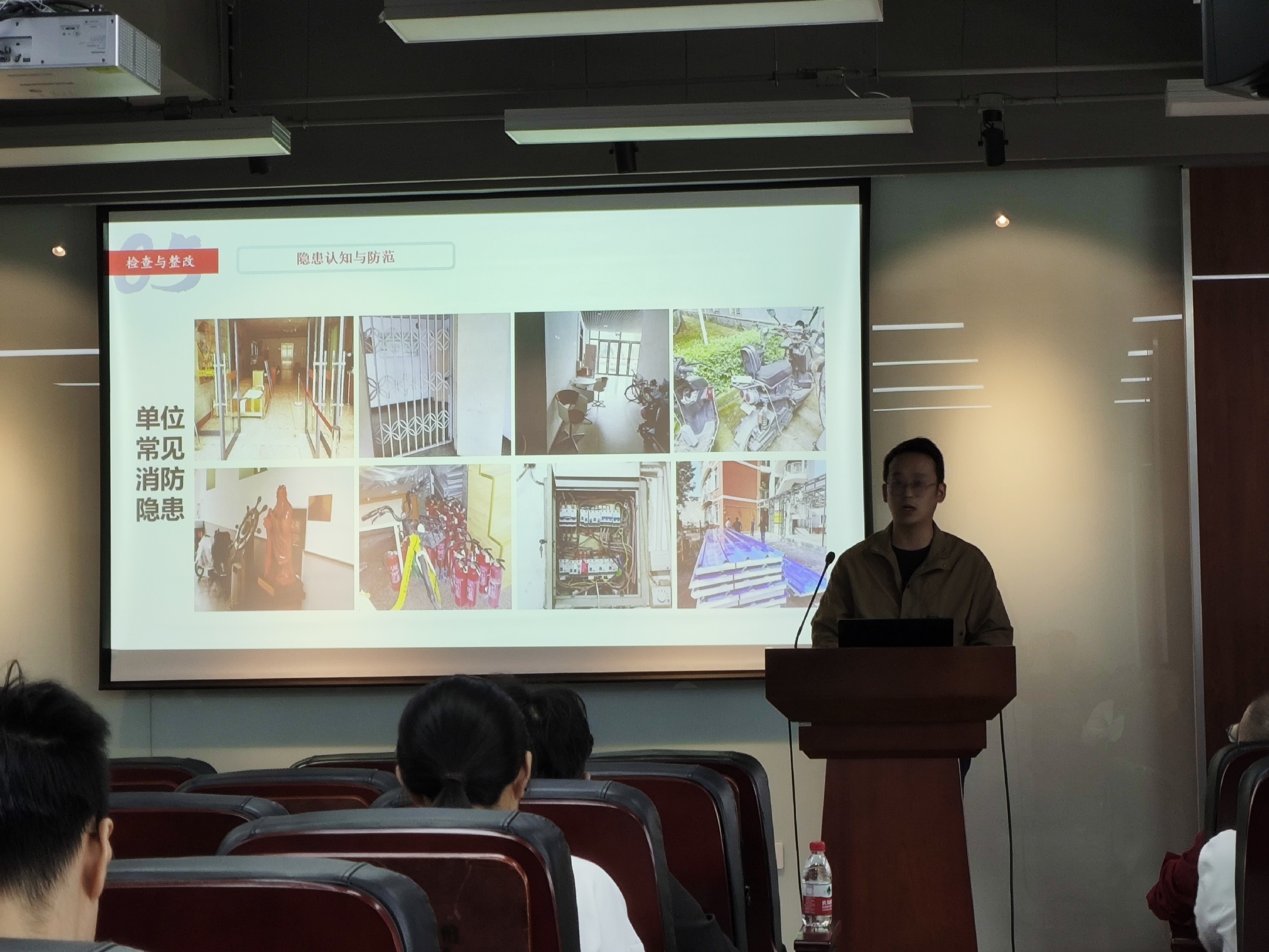 师生开展了消防安全知识讲座,讲座内容主要涉及消防法律法规、消防安全基础知识、消防隐患检查与整改、初期火灾的的处置和火场自救等方面。周老师着重强调了“预防为主、防消结合”的消防工作方针,结合有关法律法规告诫全院师生务必尽职履职,做好消防安全工作。周老师还结合高校实验室消防安全事故,对常见的火灾原因、火场应急处置方法等进行了细致的讲解,并要求全院师生积极参加消防安全演练,掌握基本的消防安全技能。最后,周老师根据日常检查工作,对我校常见消防安全隐患及整改方式进行了讲解,要求全院师生做好自查自纠,消除安全隐患。