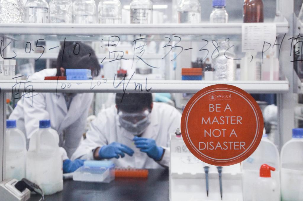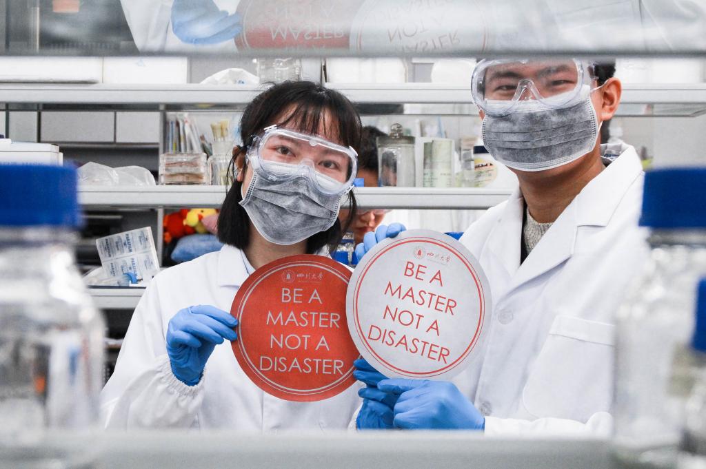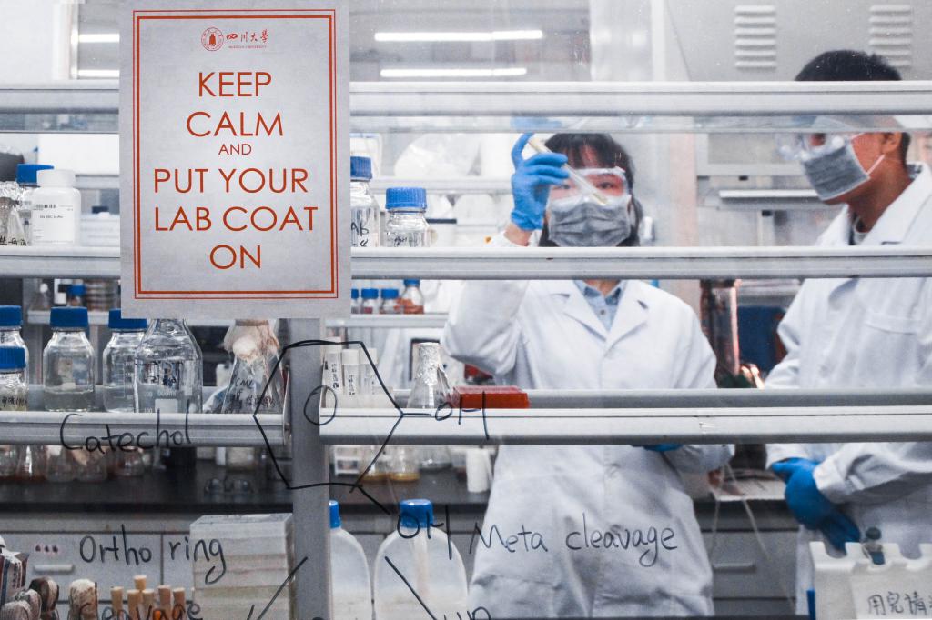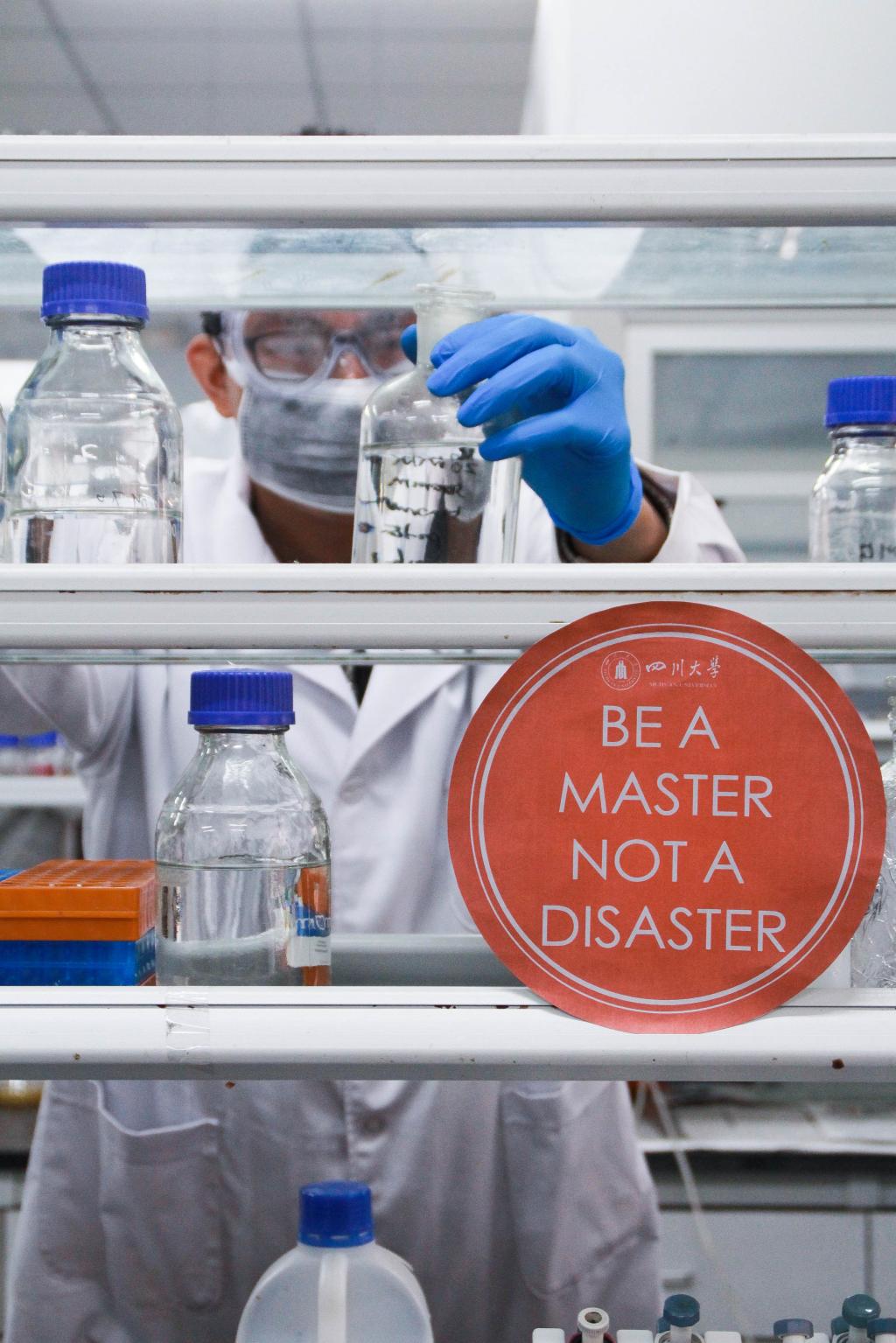 无论是细小的整理操作,还是不得有半点闪失的实验过程,都需要把实验室安全放在第一位。本系列摄影捕捉了一些实验室中的日常景象,突出了川大标识色的标语,意图通过规范的实验操作和完备的防护措施来体现实验室安全的重要性。