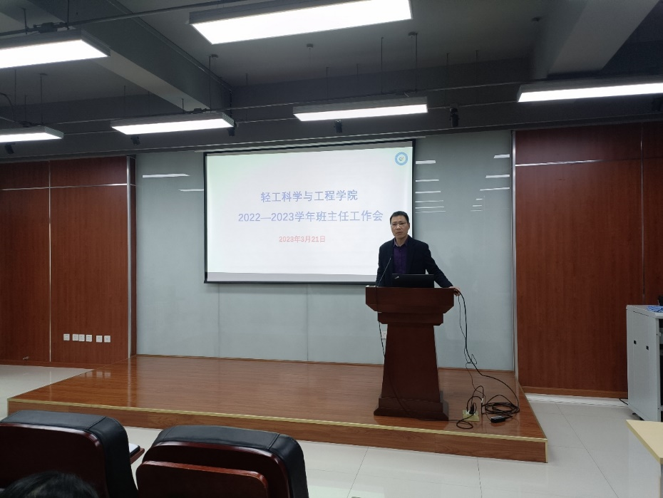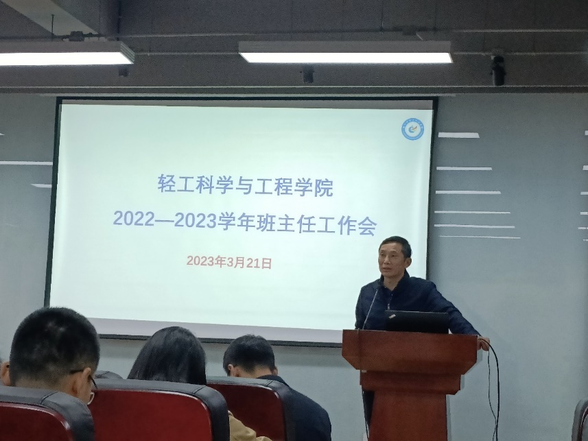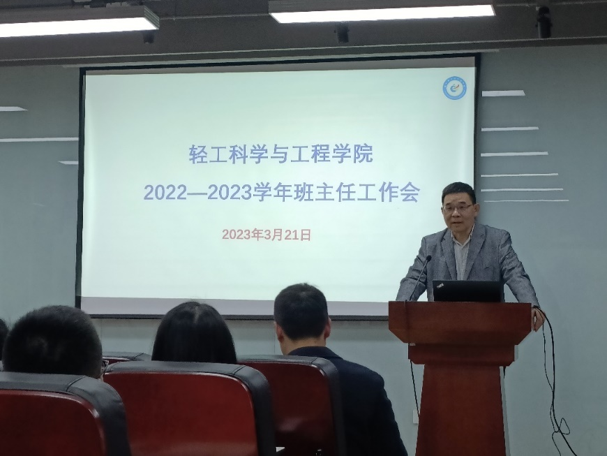 为贯彻落实“三全育人”理念,充分发挥班主任在人才培养中的重要作用�2023�3�21日下午,学院在皮革楼215报告厅举�2022�2023学年春季学期班主任工作培训会。学院党委李天富书记、彭必雨院长、冯国涛副书记、分管本科教学的副系主任、本科教学秘书、各年级辅导员及学院全体班主任老师出席会议。会议由冯国涛副书记主持�