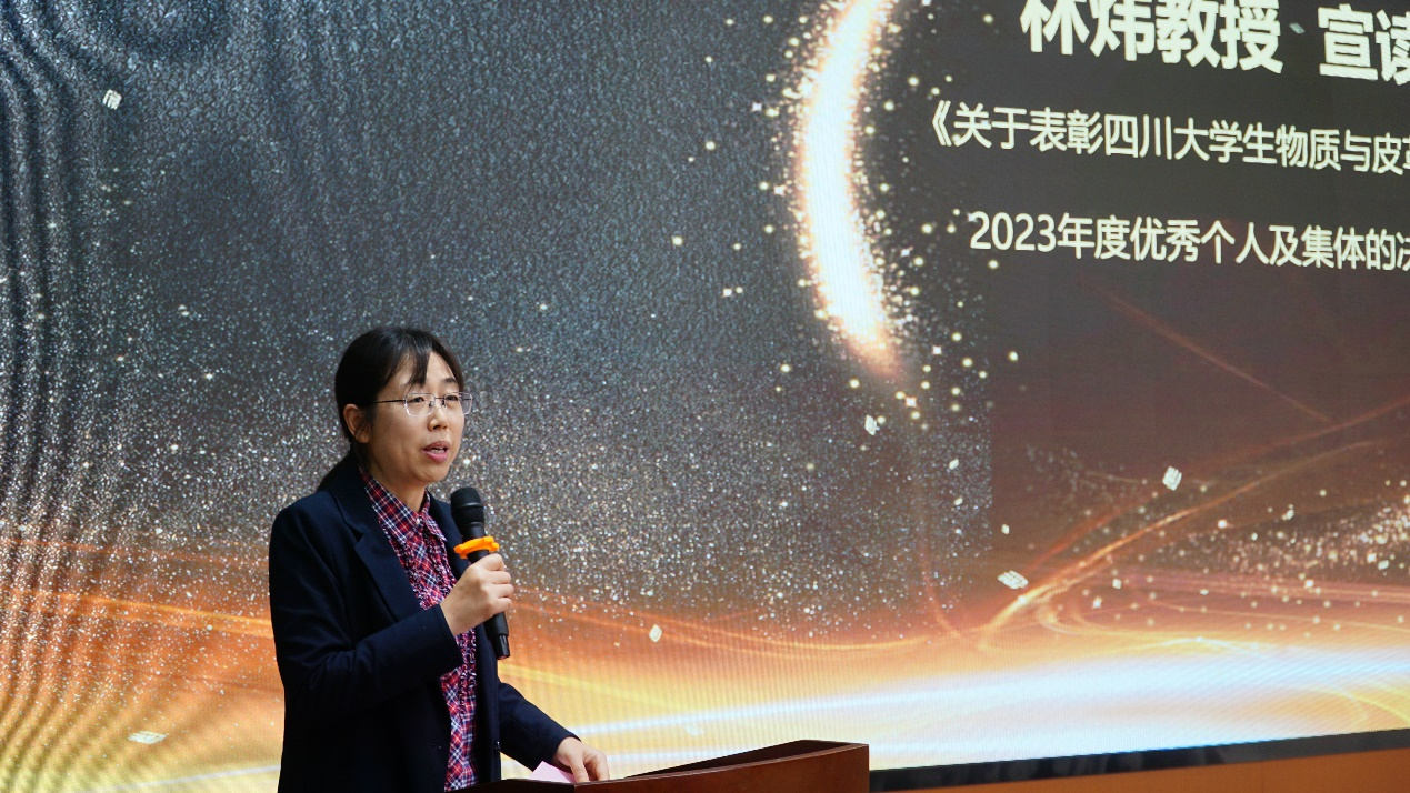 生物质与皮革工程系2023年度优秀个人、优秀班级的决定》。接下来,在隆重的颁奖音乐中,设奖单位嘉宾与学院领导为获奖同学一一颁奖并合影留念。