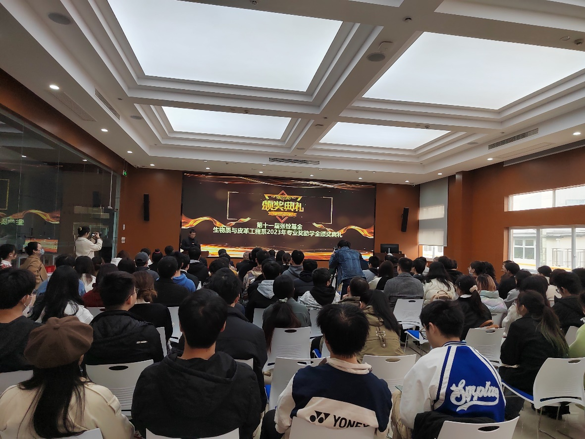 在皮革楼互联网中心隆重举行第十一届张铨基金暨生物质与皮革工程系2023年专业奖助学金颁奖典礼。