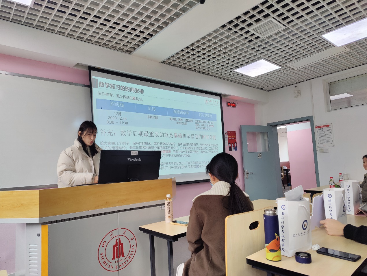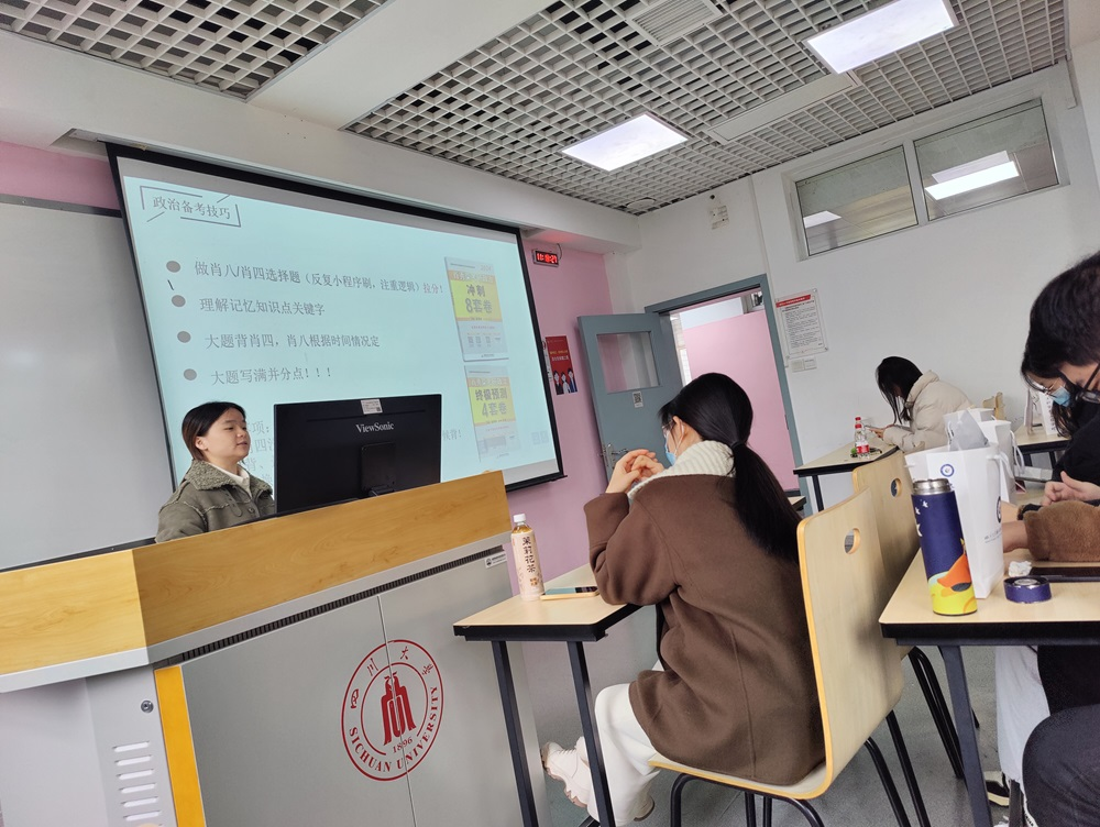 为鼓舞考研学子士气、缓解备考压力、坚定考试信心,2023年12月8日上午,学院于望江基教A315教室举行2020级本科考研冲刺交流会暨冬日送温暖活动。学院党委副书记冯国涛老师、2020级辅导员余昕玲老师以及学院思学中心考研组朋辈导师代表于佳艳、谭淋嘉同学出席本次活动。