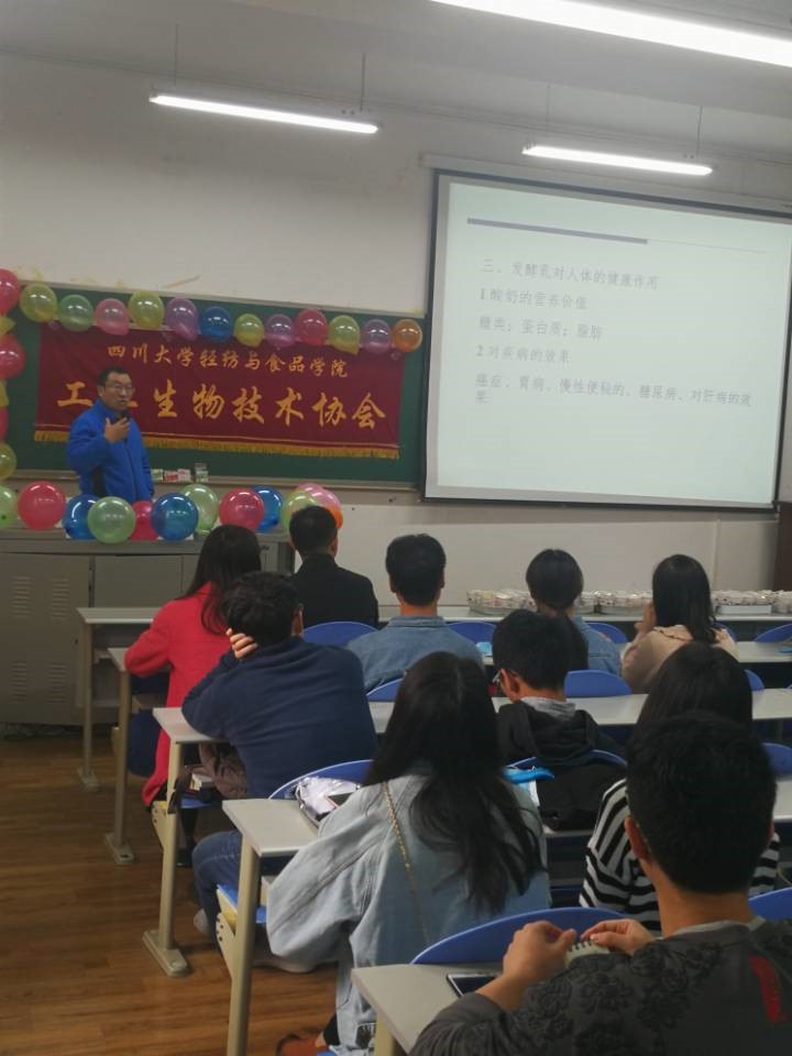 轻纺与食品学院工业生物技术协会、食品与健康协会、亚欧饮食文化研究协会联合主办的花样酸奶制作活动于2017年11月5日14:00-16:30在望江校区纺工附楼B105和B205圆满举办。本次活动由工业生物技术协会的三位指导老师:周荣清老师、黄钧老师以及吴重德老师,亲自带队,不仅吸引了全校不同学院的本科生、研究生,还有轻纺与食品学院金垚老师前来参与。
