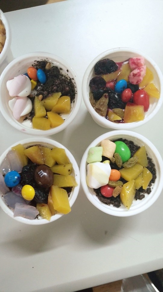 下午16;00点,所有同学完成了酸奶的制作,并进行活动的第三部分——花样酸奶DIY及酸奶品鉴。为弥补活动当天无法当场品尝自制酸奶的遗憾,活动前一天,工作人员在纺工楼实验室提前制作了45份酸奶以供酸奶DIY。活动开始后,现场人气火热,同学们纷纷利用协会提供的黄桃、坚果、奥利奥、果干等多达15种丰富的原材料调制属于自己的独一无二的花样酸奶。