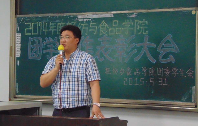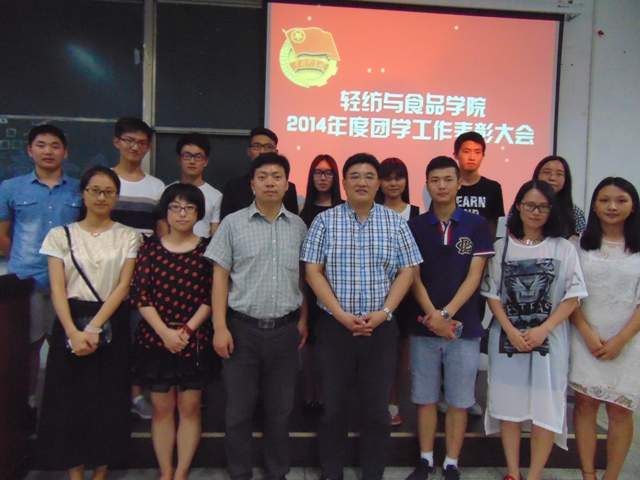 2015年5月31日,轻纺与食品学院2014年度团学工作表彰大会于江安校区综合楼C座205教室隆重举行。院党委副书记刘晓虎副教授,团委书记苏德强老师,团委副书记李晓秀老师、贺婷老师,2014级辅导员向星烨老师,2012级辅导员王舒灏老师,2013级辅导员高江帆老师及获奖学生代表参加了本次大会。会议由院团委学生副书记程天鹏同学主持。
