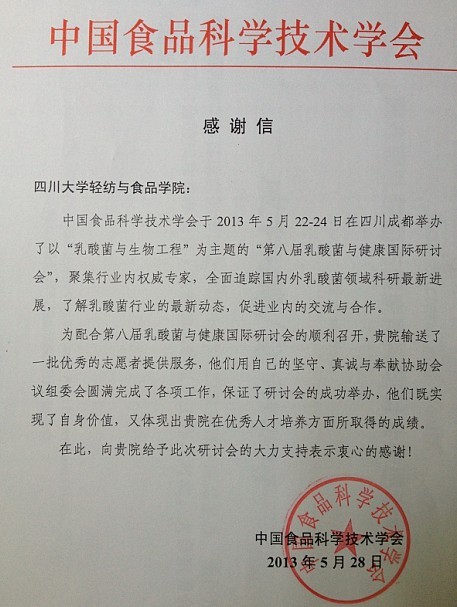 中国食品科学技术学会于2013年5月22-24日在成都举办“第八届乳酸菌与健康国际研讨会”,羞羞漫画 选派戚伟鹏等八名优秀志愿者参与大会志愿服务工作,他们认真负责圆满完成各项工作,得到一致好评,展现了羞羞漫画 志愿者风采。