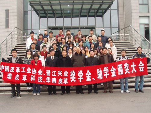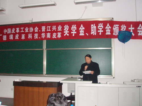 设立奖助学金表示由衷的感谢,对获奖同学表示衷心的祝贺。同时也对所有同学提出殷切的期望,希望同学们再接再厉,争创更加优异的成绩,回馈社会对皮革系的支持与鼓励。徐永会长代表中国皮革工业协会表达了对获得奖学金同学的祝贺,阐述了协会长期以来在我系设立奖学金的宗旨,同时也勉励我系学生勤奋学习,为我国皮革行业的“二次创业”贡献力量。罗丰旭副总裁则代表晋江兴业皮革有限公司简介了公司的情况,也提出了现在皮革行业所面临的各种压力与挑战,尤其是对高素质人才的需求量越来越大,希望我们的学生能够抓住机遇,努力学好专业知识,在以后的工作中展示自己的才华。随后各位嘉宾及与会领导为获奖同学颁发了荣誉证书,最后来自2006级轻化工程专业的获奖同学代表王玄进行了发言,她首先对获奖单位的支持与鼓励表示真诚的谢意,同时也表示在今后的学习生活中,一定以此为新的起点,更加勤奋努力,不辜负社会各界及学院领导的殷切期望,用自己的实际行动来回报社会。