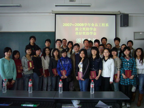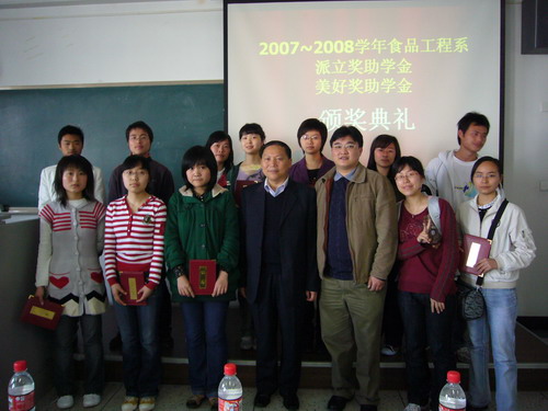 —美好奖助学金、派立奖助学金颁奖典礼在江安校区一教B503隆重举行。出席本次颁奖典礼的嘉宾及院领导有派立食品有限公司陈贵良总经理,轻纺与食品学院党委副书记刘晓虎副教授。颁奖典礼由冯国涛老师主持,2006级食品科学与工程专业的全体同学及各年级获奖同学共计100余人参加了本次颁奖典礼。