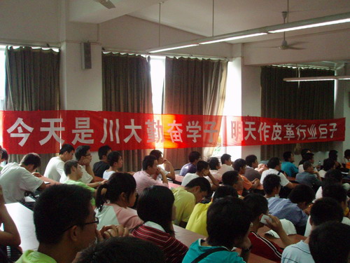 报告会前,同学自发在会场挂上了“衷心感谢段镇基院士对2007级新生的关爱”、“今天是川大勤奋学子,明天做皮革行业巨子”的横幅。