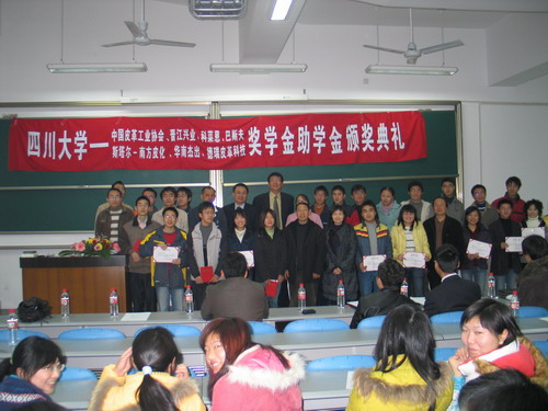 生物质与皮革工程系专业奖学金颁奖典礼在江安校区综合楼C304隆重举行,此次颁奖典礼共颁发七个项目的奖助学金,他们分别是:中国皮革工业协会奖学金、广东华南杰出奖助学金、斯塔尔-南方皮化奖助学金、德瑞皮革科技奖学金、科莱恩实习奖学金、BASF奖学金和晋江兴业助学金。参加本次颁奖典礼的人员有:设奖单位颁奖嘉宾,轻纺与食品学院院长、生物质与皮革工程系主任陈武勇教授,副院长何有节教授,院党委副书记刘晓虎老师,生物质与皮革工程系副系主任张宗才教授、刘彦副教授,生物质与皮革工程系杨淑娟老师、陈家丽老师,院学生工作办公室冯国涛、李晓秀老师,全体获奖学生,学院2005级、2006级全体轻化工程专业、轻工生物技术专业学生。颁奖典礼由院团委书记祝蔚老师主持。