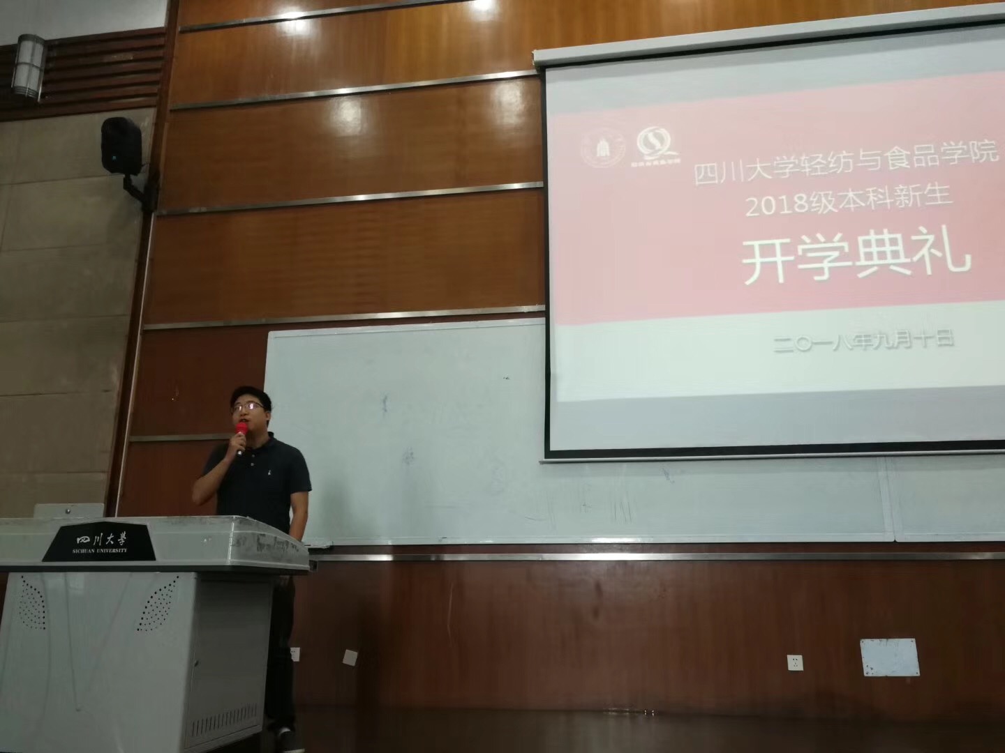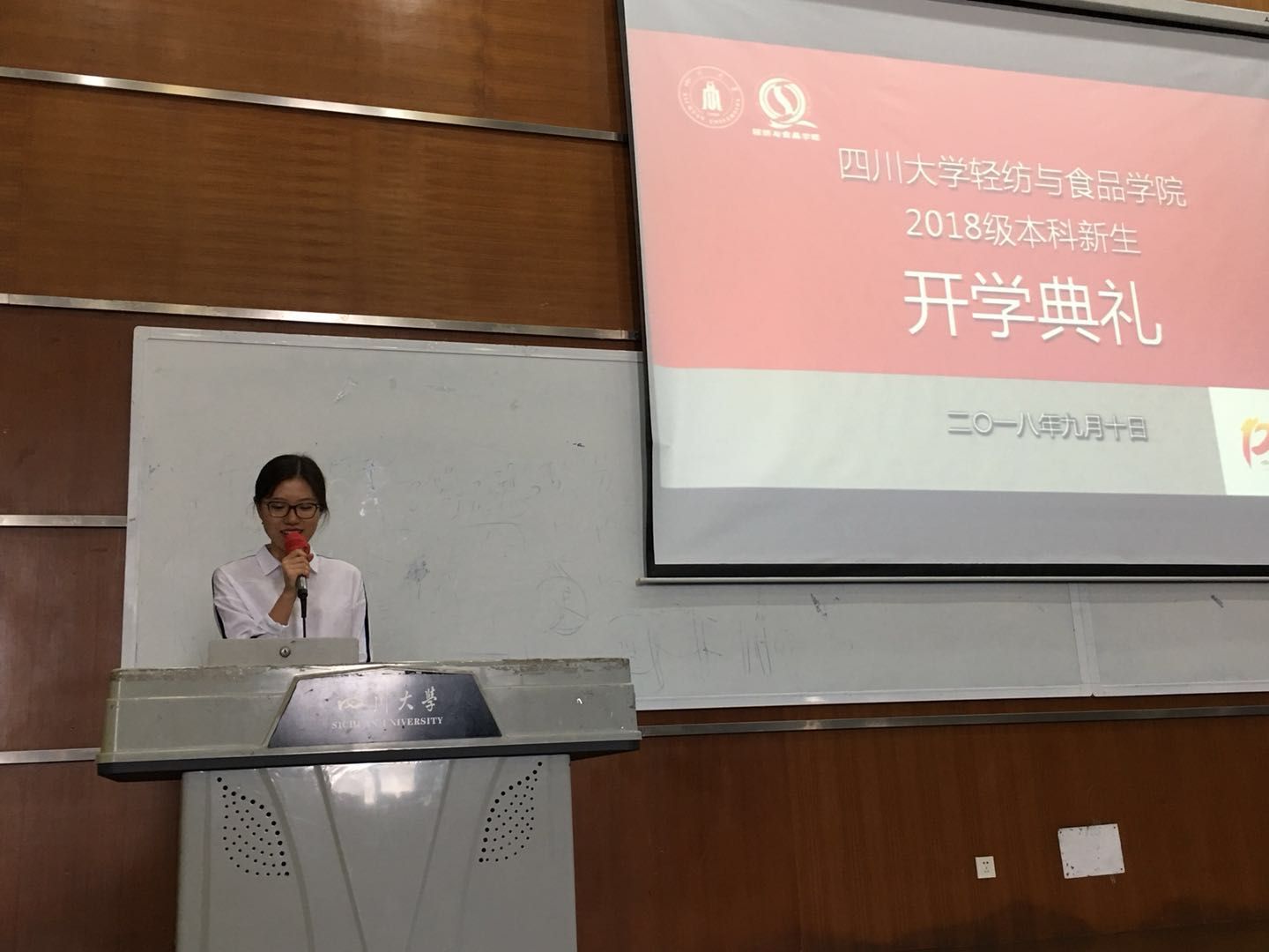 201891014:30,天高云淡,百年川大呈现出一片开阔明朗之景,此时轻纺与食品学院2018级本科生开学典礼在综C407隆重举行。学院党委书记刘晓虎副教授、院长何有节教授、党委副书记冯国涛老师、副院长何强教授、副院长肖凯老师、生物质与皮革工程系副系主任程海明教授、食品工程系副系主任贾利蓉教授、纺织与服装工程系副系主任赵武副教授、教导员邱华明老师、辅导员李晓秀老师、杨维老师共同出席此次典礼。还有部分家长代表及学子们齐聚一堂,共同开启振奋人心的川大新学期之旅。