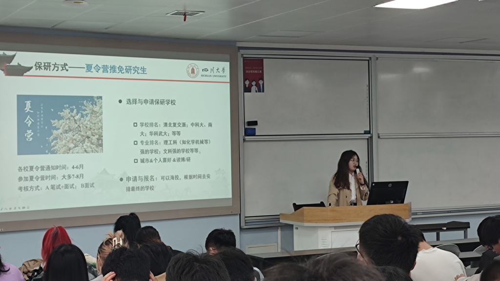 2022年3月25日下午,由思学中心主办的2022年保研分享会在江安一教B207教室举行。出席本次分享会的嘉宾有2020级本科生辅导员余昕玲老师、思学中心朋辈导师侯静雯和燕彤彤学姐,以及2020级全体本科生。分享会由思学中心宣传委员、2021级本科生周琳森同学主持。