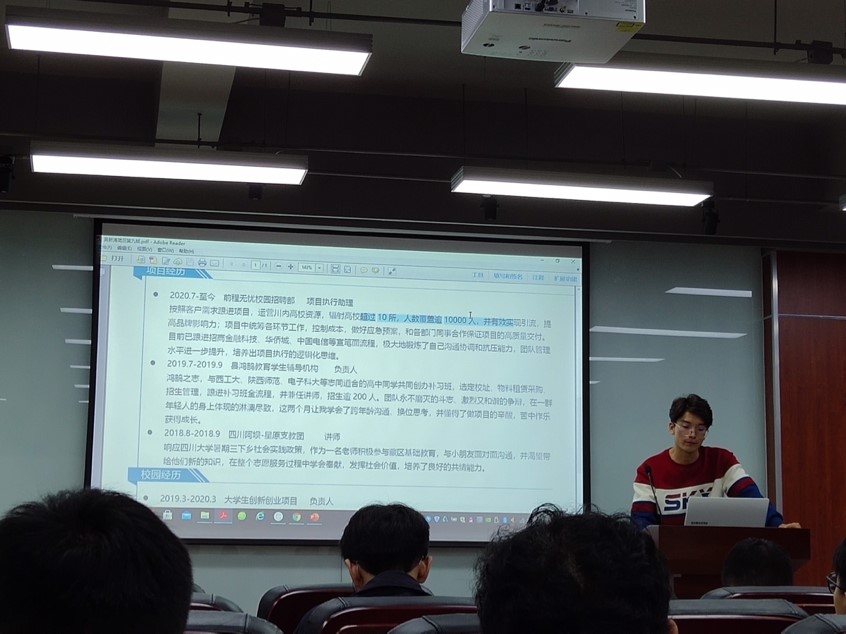 2017级轻化工程专业吴新涛同学主要分享简历的排版与制作,他以优秀学长的简历为参考,直观而又细致地分析了每一份简历的利弊,并建议大家简历排版及内容一定要清晰简约、内容明确�
