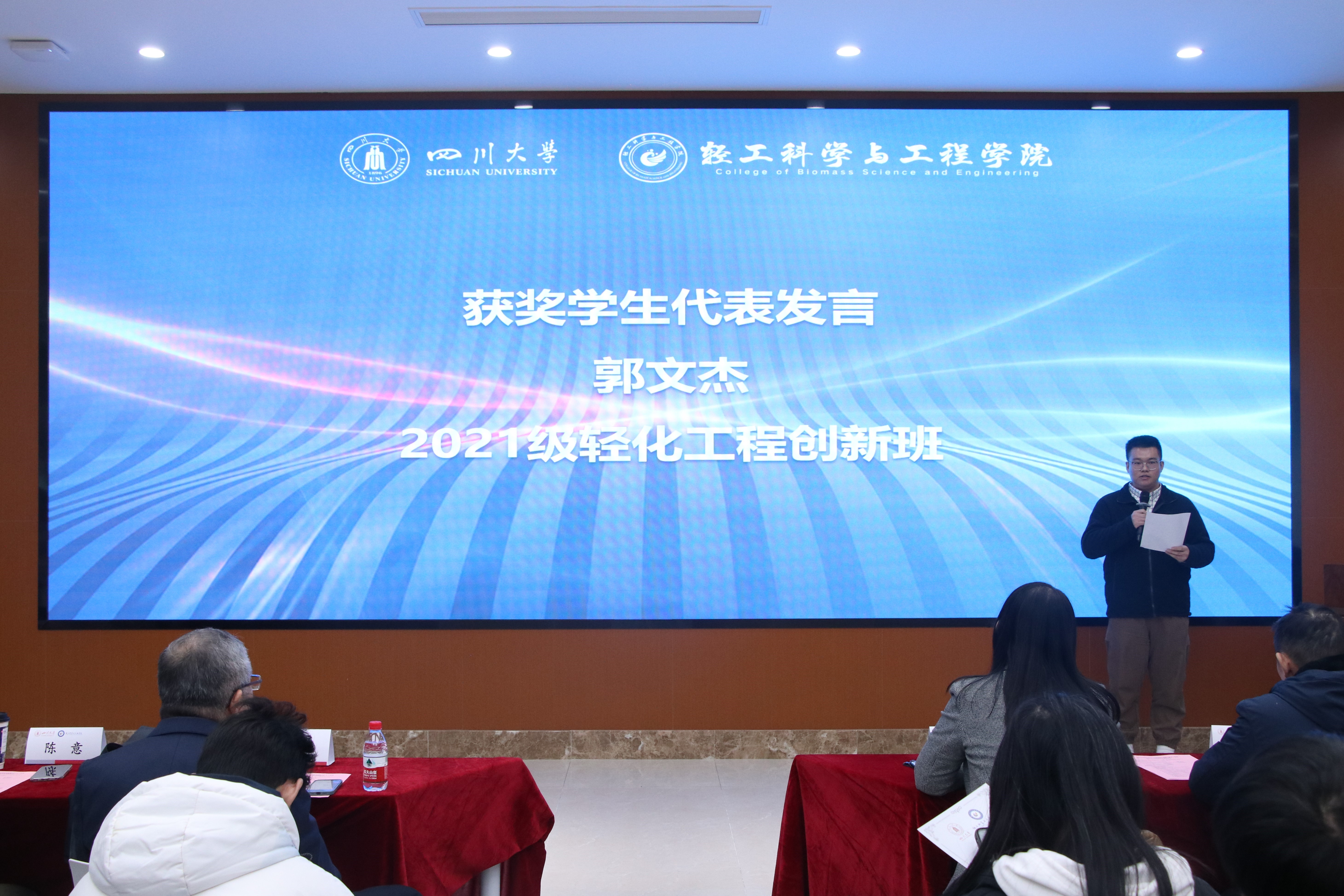 最后,2021级轻化工程专业创新班的郭文杰同学作为获奖学生代表进行了发言。郭文杰同学深情回顾了自己的学习与生活经历,并向中国皮革协会、行业领军企业以及校友们表达了由衷的感激之情。他表示,定将倍加珍惜这份来之不易的荣誉,以更高的标准要求自己,铭记“海纳百川,有容乃大”的校训精神,传承轻化工程领域前辈们的高尚品质,以更加优异的成绩回馈行业、社会及学校,为轻工业的发展贡献自己的力量。