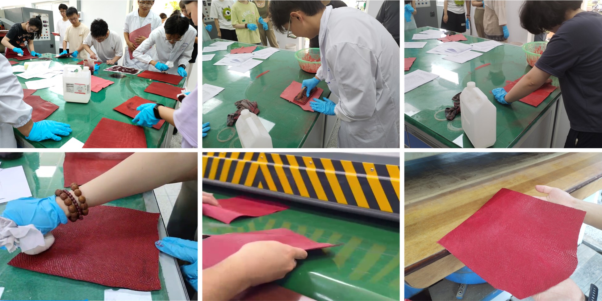余跃、程鑫和张金伟三位老师和社团干事共同组织开展了一场皮革涂饰实践活动。
