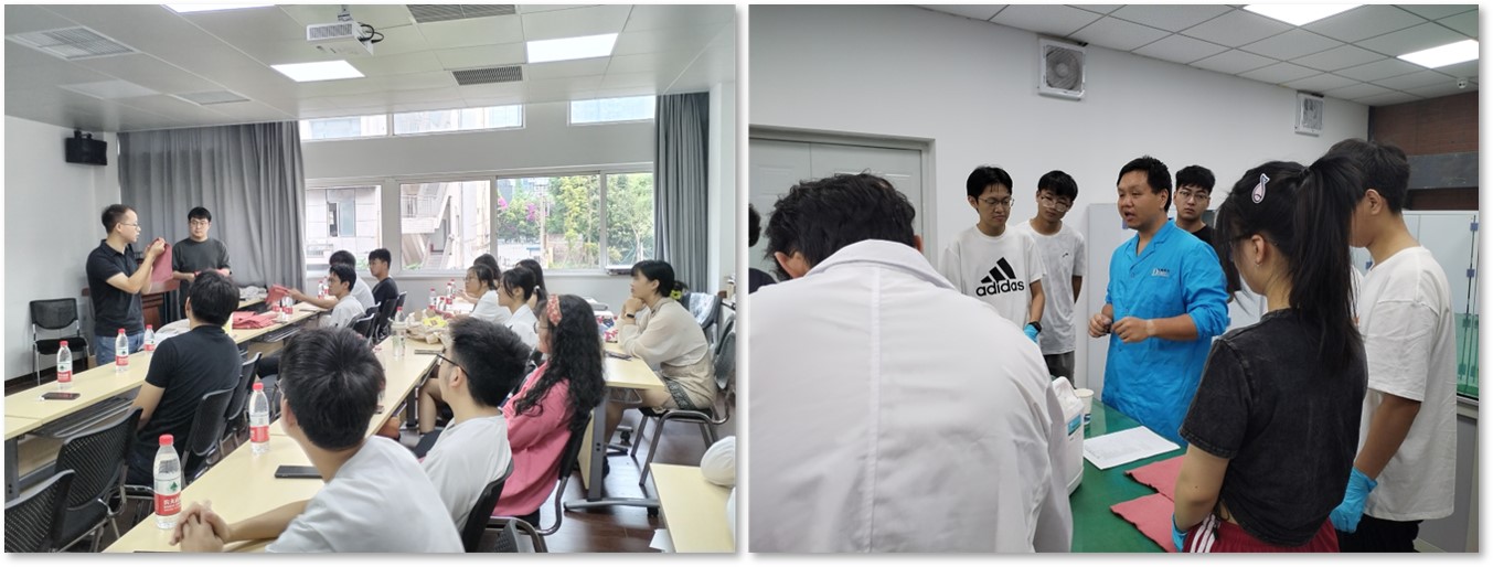 余跃和程鑫两位老师为同学们详细讲授了实验皮料的来源、前期加工工艺及本次涂饰技术所涉及的科学原理,倡导同学们理论与实践相结合,感受制革科技的魅力。张金伟老师则为同学们介绍了涂饰的工艺流程,并亲自指导他们调配浆料并进行实际操作,提升同学们的动手能力。