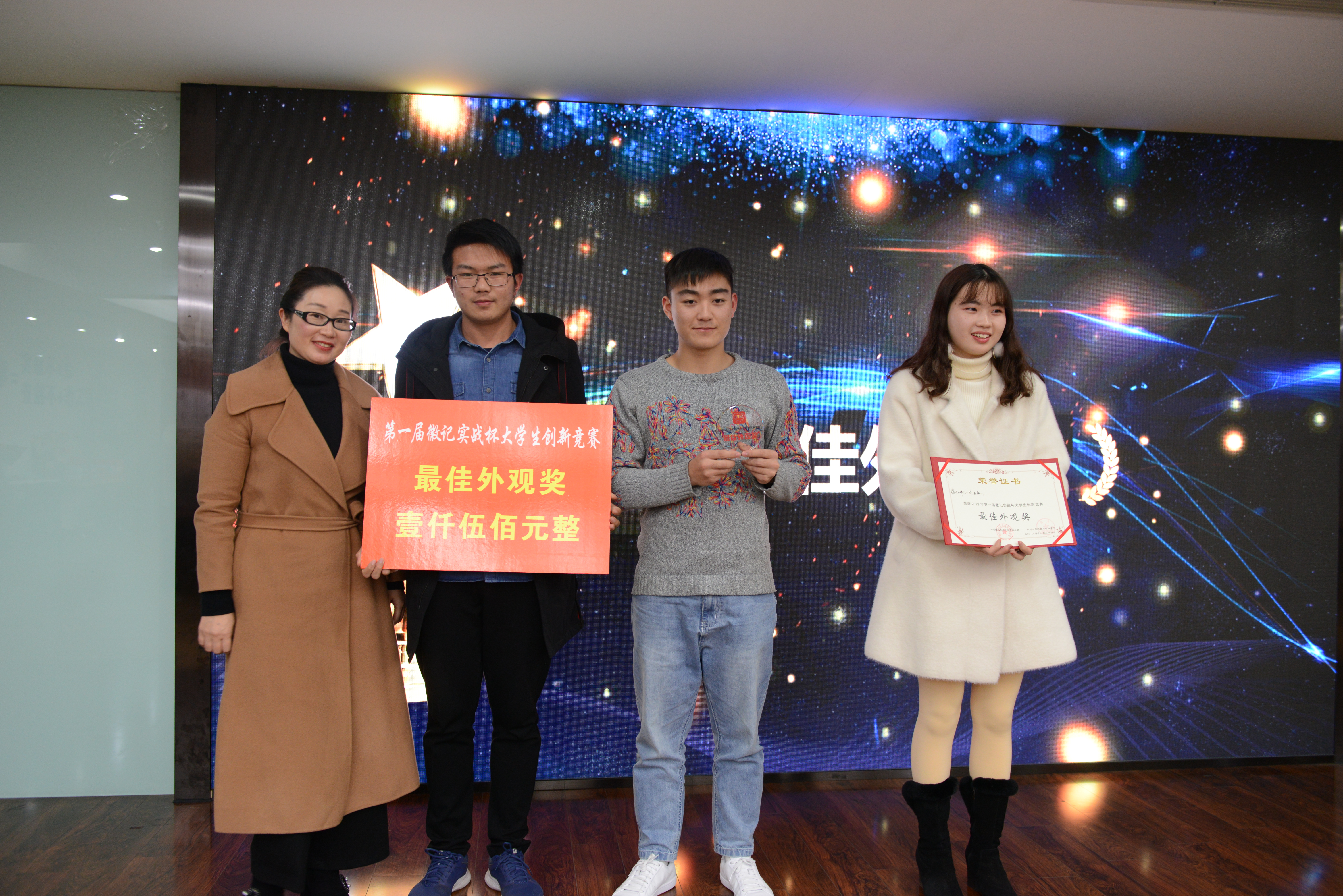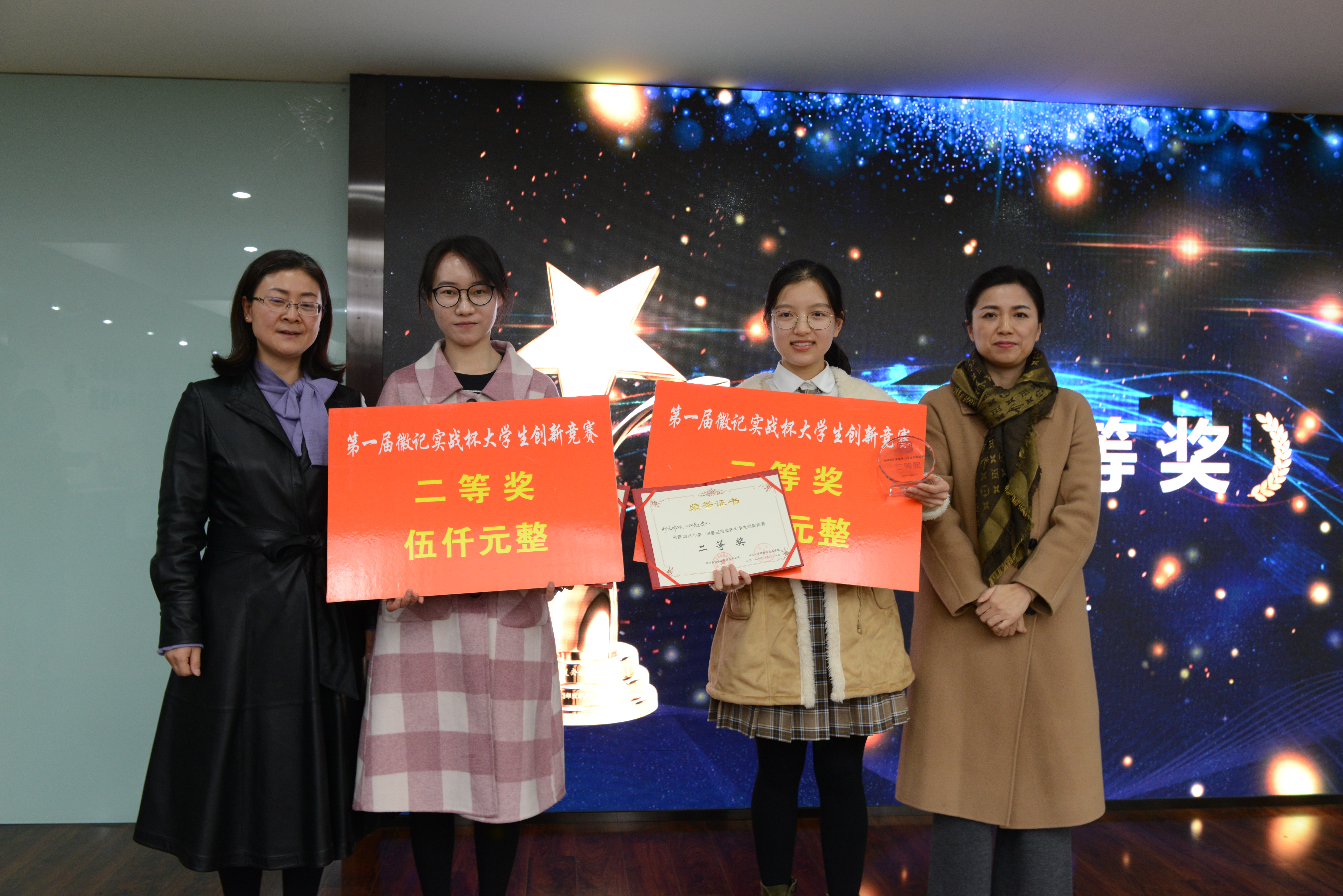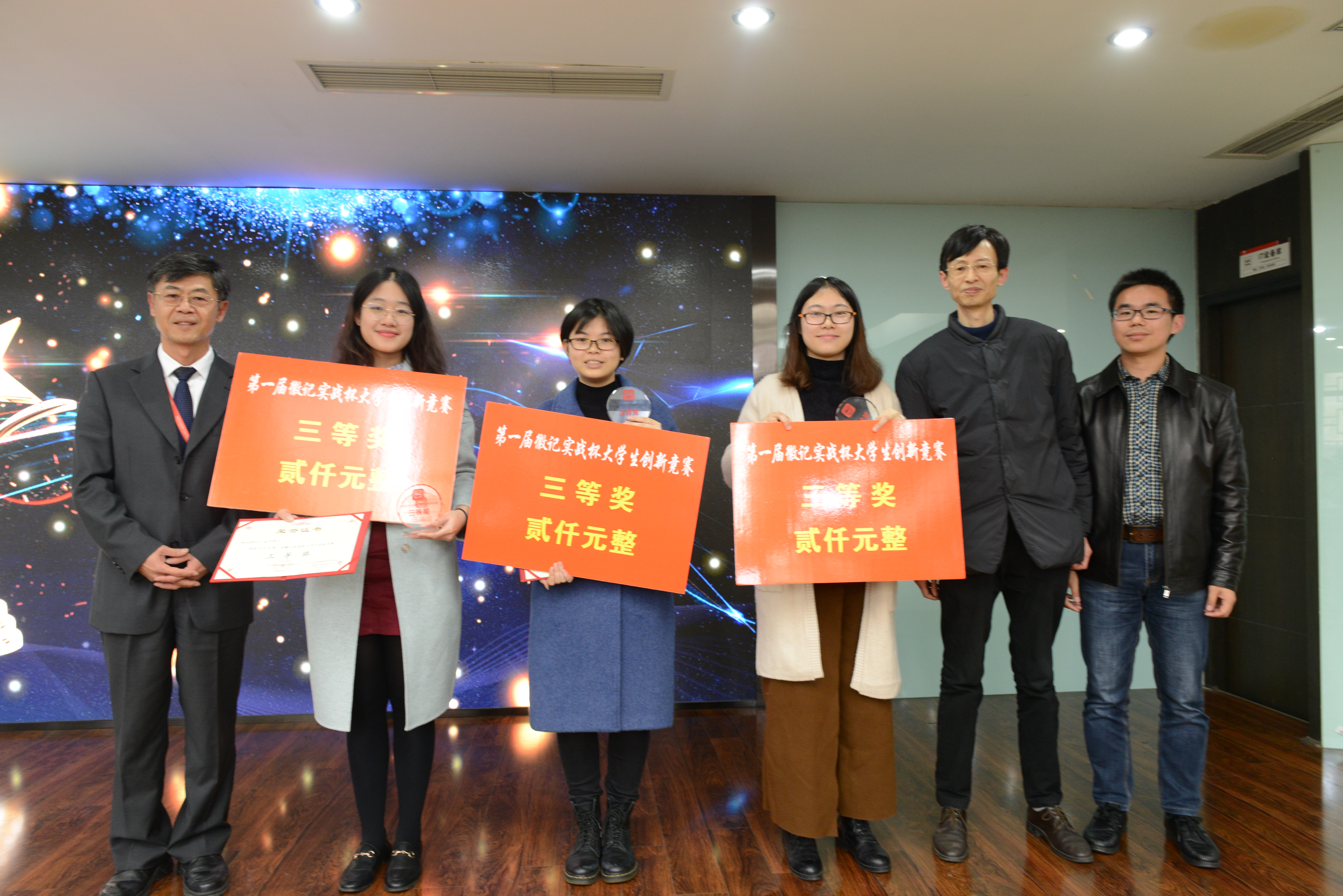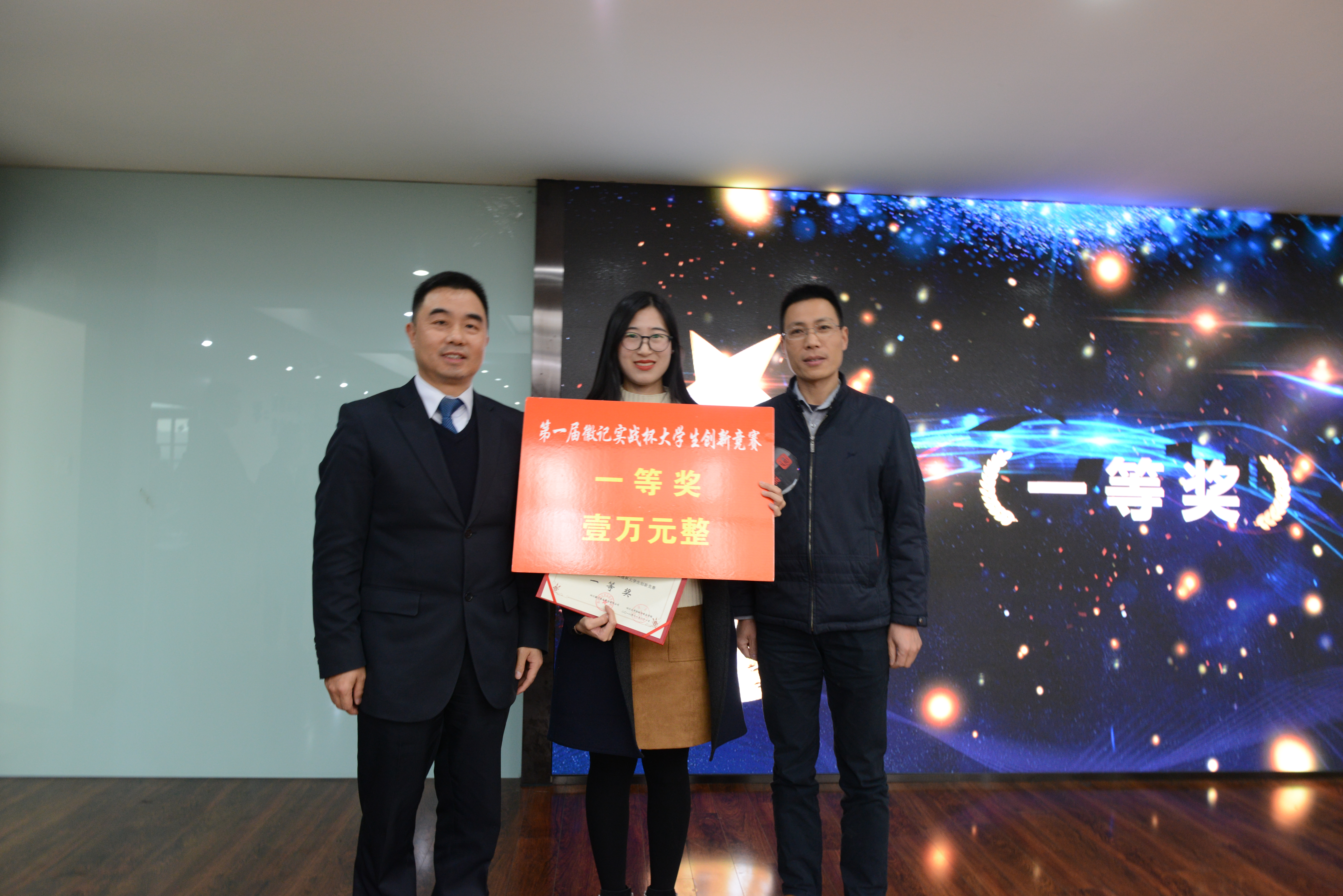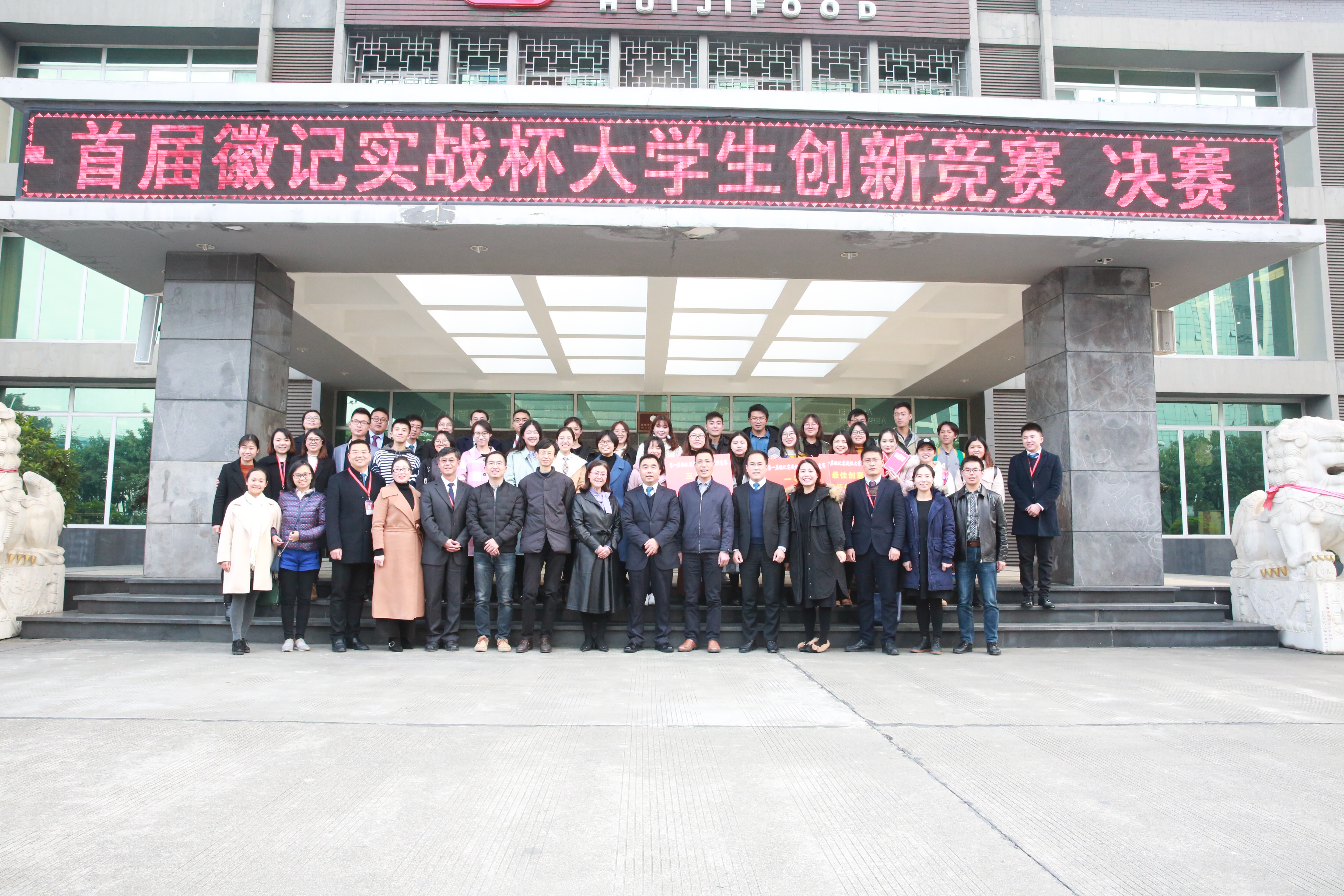 徽记股份有份有限公司董事长吕金刚先生和轻纺与食品学院冯国涛副书记先后为决赛致辞;在主持人介绍了入围决赛的队伍、比赛规则、评分细则以及奖项设置后,入围队伍进行了作品展示;经过激烈角逐,首届“徽记实战杯”大学生创新竞赛决赛结果顺利出炉。