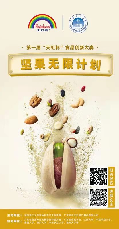为进一步推进全国高校大学生创新教育,助力年轻人成长,有效联动高校和食品加工企业的创新能力,为食品及相关专业学生提供实践与技能展示的平台,为食品行业提供创意思路与方案,从而促进食品行业创新发展,华南理工大学食品科学与工程学院与广东南兴天虹果仁制品有限公司共同主办第一届“天虹杯”食品创新大赛。