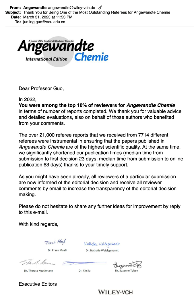 生物质与皮革工程系郭俊凌教授荣获国际著名化学期刊《德国应用化学》(Angewandte Chemie)颁发的2022年度杰出审稿人奖(Outstanding Referee)。《德国应用化学》是德国化学学会(Gesellschaft Deutscher Chemiker, GDCh)官方期刊,出版范围涵盖了化学研究的各个领域且持续保持领先地位,目前已成为世界化学领域最具学术影响力和品牌影响力的期刊。