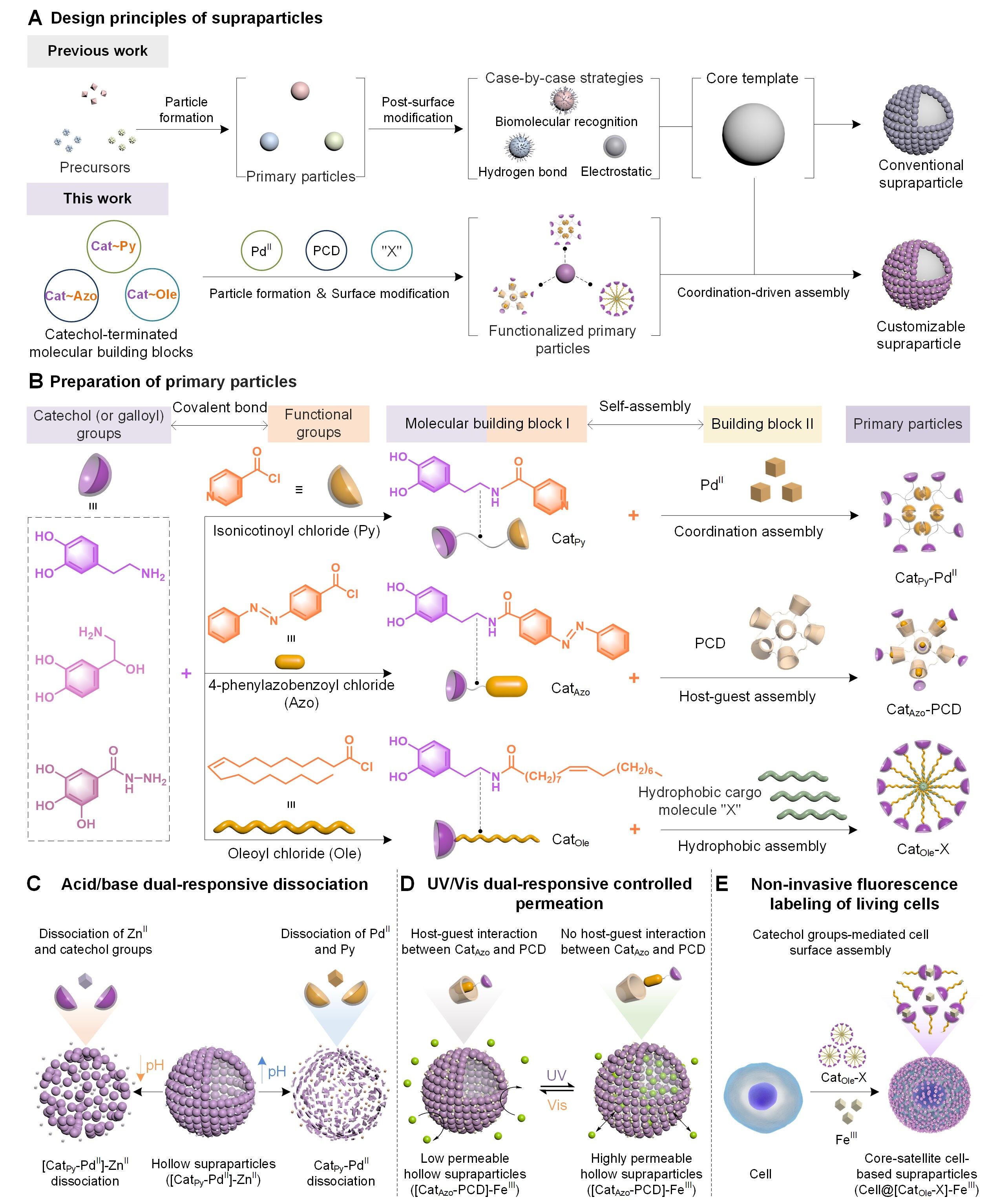该团队首先将邻苯二酚基团与多种功能基团偶联,包括异烟碱酰氯(Py)、4-苯基偶氮苯甲酰氯(Azo),油酰氯(Ole),形成以邻苯二酚为末端的母体分子单元。该母体分子可以通过多种分子间相互作用(即金属络合、主客体相互作用和疏水相互作用)获得初级纳米颗粒(图1B)。这些初级纳米颗粒包含丰富的邻苯二酚基团,因此可以进一步通过多酚与金属络合作用实现二级超结构颗粒构建。该团队证明了,通过将不同的功能基团与邻苯二酚基团结合,可以获得具有一系列功能的超结构颗粒,如酸碱双pH响应性(图1C)、光控渗透性(图1D)和膜非损伤的细胞标记(图1E)。该研究为构建具有可定制化功能和多层级结构的超级颗粒系统提供了新的策略和研究思路。该文通讯作者为郭俊凌教授和龚贵东副研究员(专职科研),第一作者为轻工学院2021级博士研究生张亚静、材料学院本科生王瑾(现芝加哥大学博士研究生)和轻工学院何云翔副研究员(专职科研)。国际著名超分子学家Ian Manners教授也对该研究提出了宝贵的建议。