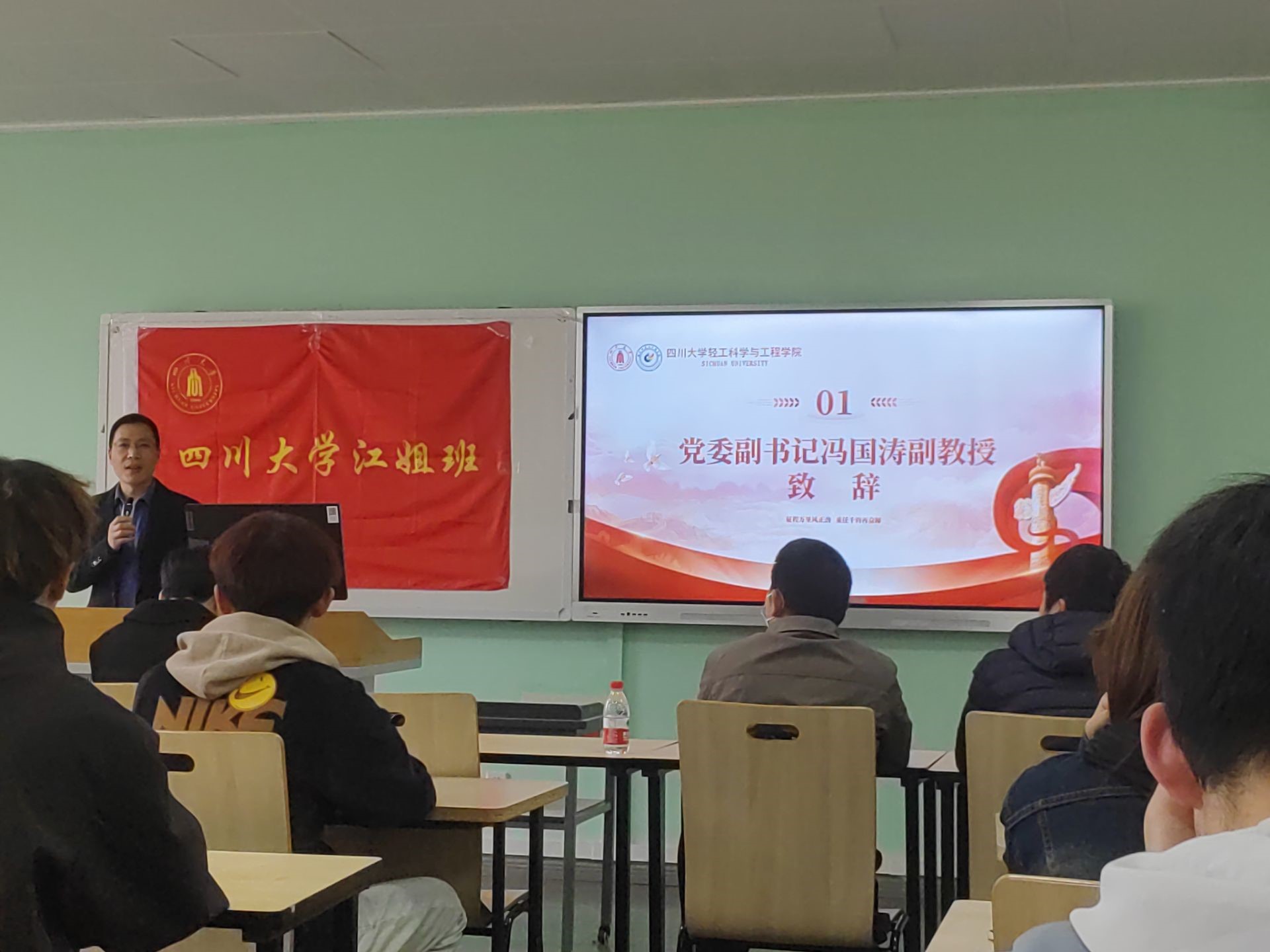 首先,冯国涛副书记介绍了学院制定的江姐班“321”建设实施方案,“3”是江姐班同学需做好思想、学习、创新三项基础工作,整体达到思想品行优、学习氛围浓、科研基础实的目标要求;“2”是江姐班需聚焦以铸魂工程实现自身素养提高和以弘扬实践实现红色文化传播两项核心工作; “1”是江姐班同学需达成德智体美劳全面发展的个人成长目标。同时,冯书记对江姐班建设提出了三点希望:一是辅导员和班主任需做好统筹指导,推进江姐班各项活动的顺利开展;二是江姐班班委要落实落细、分工合作,共同推动各项活动的组织开展;三是江姐班全体同学积极参与、全力配合,在这个荣誉集体中实现个人成长。