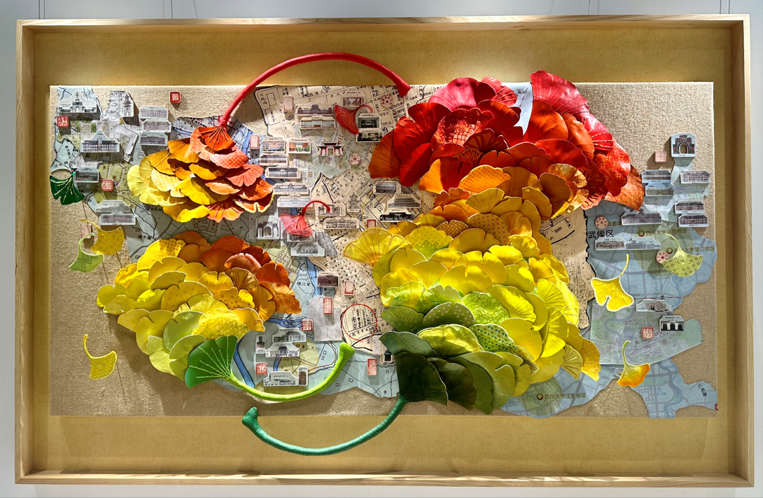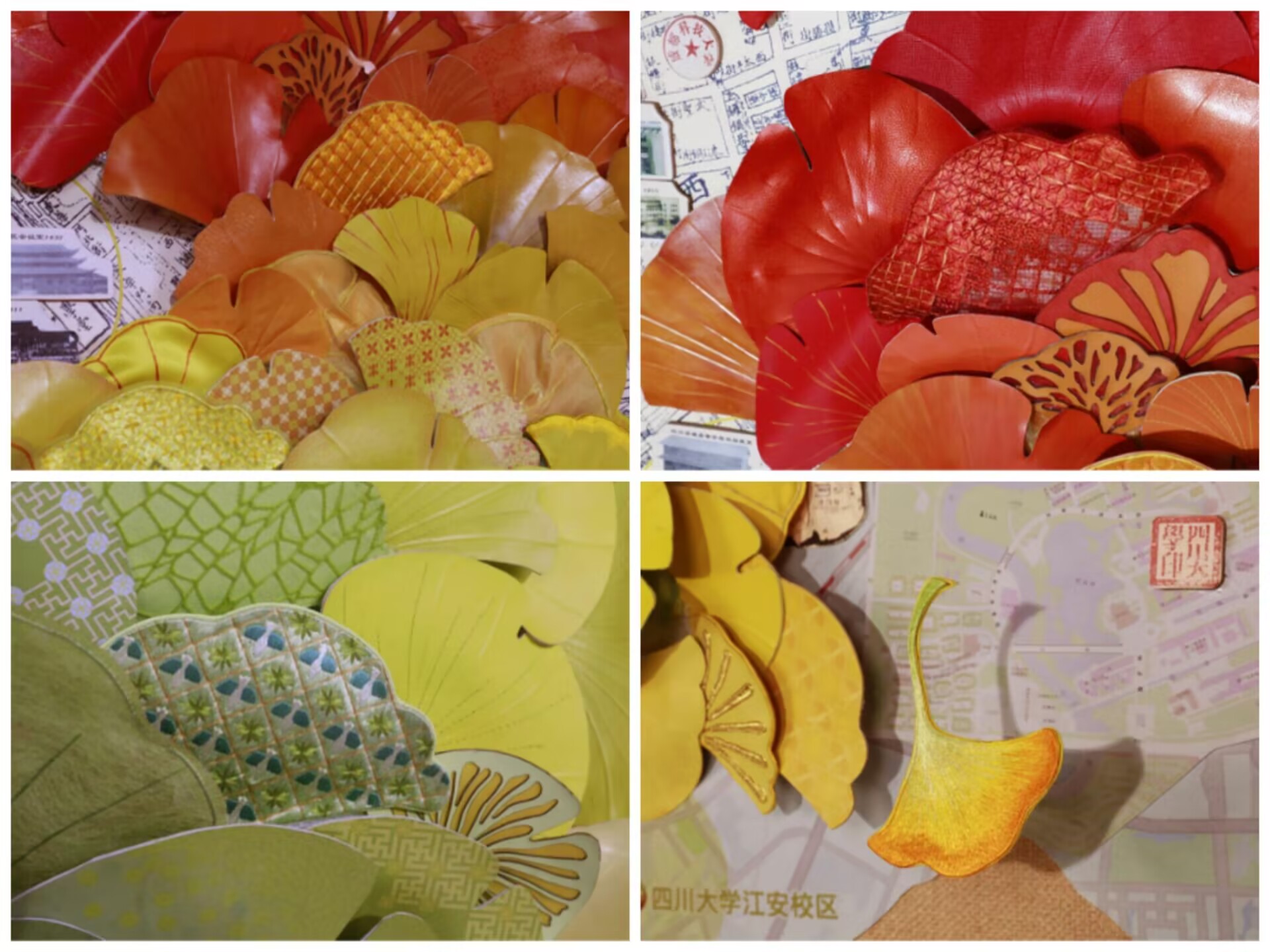 《永续》以四川大学百年历史为灵感,通过128片银杏叶的巧妙布局展现了川�128年的发展历程和不断探紀蜕变的精神�