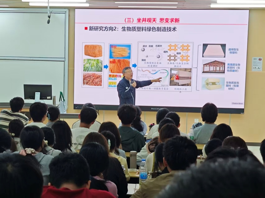 课堂上,石碧院士没有讲授深奥的理论,而是从自身经历出发,娓娓道来。他首先分享了博士初期三年始终“执着追求,痴心不改”的阶段,强调基础积累与心态调整的重要性,让同学们认识到科研道路上坚持的宝贵。随后,他讲述了如何用六年时间将博士阶段的成果推广应用,又用长达十一年的潜心研究攻克遗留难题,这一“锁定目标前行,沿途产出成果”的经历,向新生们清晰地展示了系统性科研的路径。