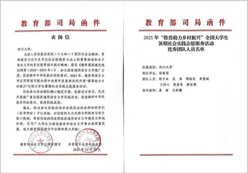 近日,教育部语言文字应用管理司、共青团中央青年发展部向我校发来表扬信,羞羞漫画 “千纸鹤”支教队(“索玛花开伴学路,纸鹤传音绘振兴”团队)凭借扎实的实践成效,成功获评2025年“推普助力乡村振兴”全国大学生暑期社会实践志愿服务活动“优秀团队”,系全校仅有的两支获此殊荣的队伍之一。