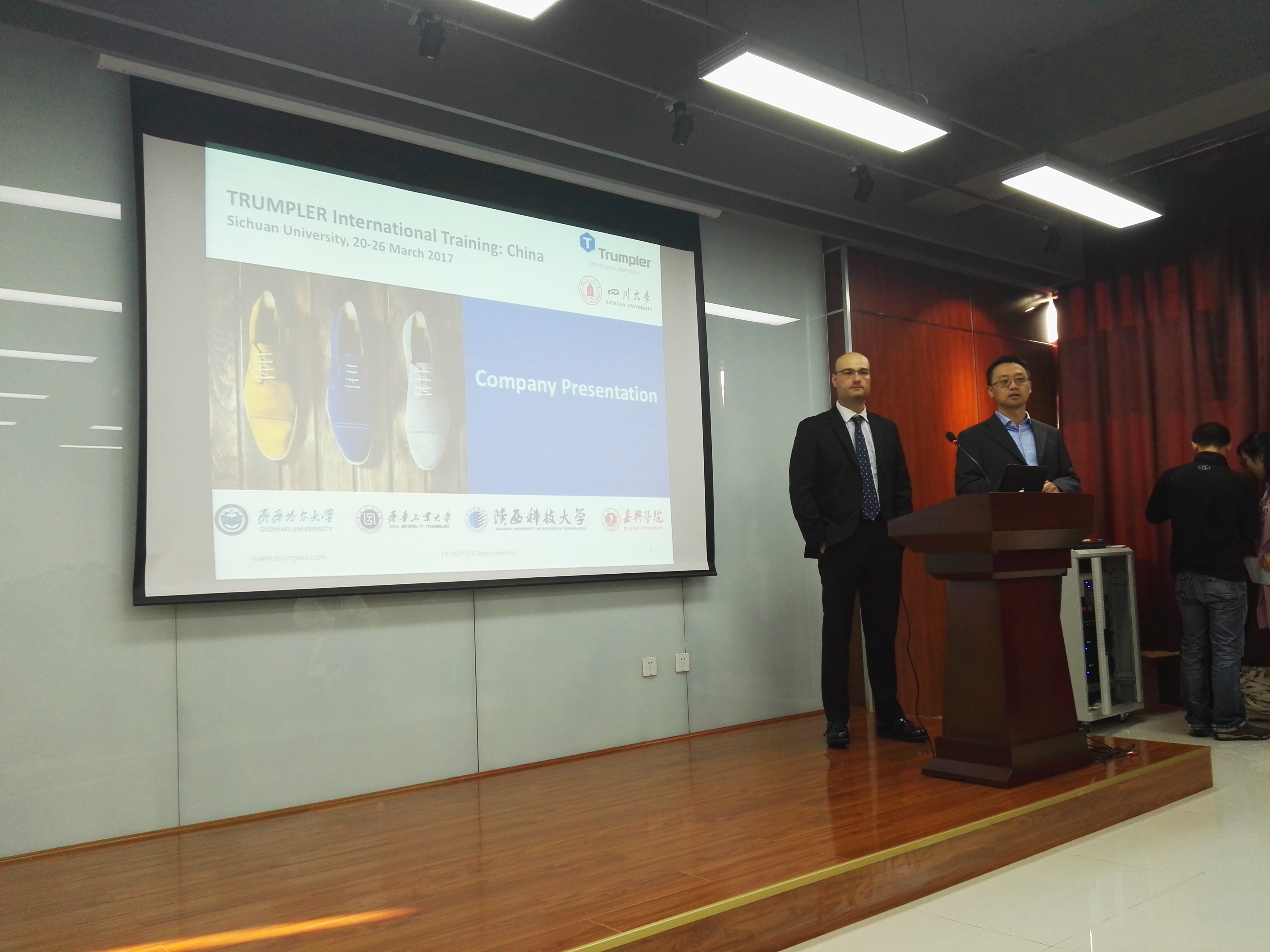 皮革楼二楼报告厅举行,开班仪式之后进行了“Open Lecture”。 出席开班仪式的TRUMPLER公司嘉宾有汤普勒中国总裁Mr.Joaquin Linzoain Acedo(西班牙籍)、汤普勒中国总裁张建维先生以及汤普勒德国、汤普勒西班牙以及汤普勒中国研发、推广和技术团队共计12人。