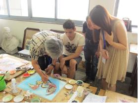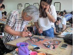 江安校区第二基础实验楼的A313绘画教室讲学。首先,竹原教授用PPT为同学们展示了日本绘画的起源历史,中日绘画史比较,以及日本画近现代别于源流个性发展的状况,并通过赏析绘画作品《玉虫厨子》(飞鸟时代)、《法隆寺金堂壁画》(奈良时代)、《源氏物语绘卷》(平安时代)、《鸟兽人物戏画卷》(镰仓时代)、《松林图屏风》(桃山时代)、《风神雷神图屏风》(江户时代)等,使得同学们对日本的绘画有了初步印象。此次课程,还吸引了来自美国、英国、希腊的学生参与学习。在之后的教学中,已经是七十多岁高龄的竹原教授亲自作绘画示范,从最开始的裱纸到后来的研磨矿物颜料,每一个环节步骤都丝丝紧扣,同学们也是乐在其中,学在其中。到后期的绘画制作装饰上,竹原老师为大家讲述了矿物质颜料烧烤后的色彩变化,金箔以及贴好金、银、铜箔后用硫化钾烧化变色的特殊效果,用特有的“色箔交替”的艺术手法,使得同学们的画面更添上一丝岩彩画特有的神圣。